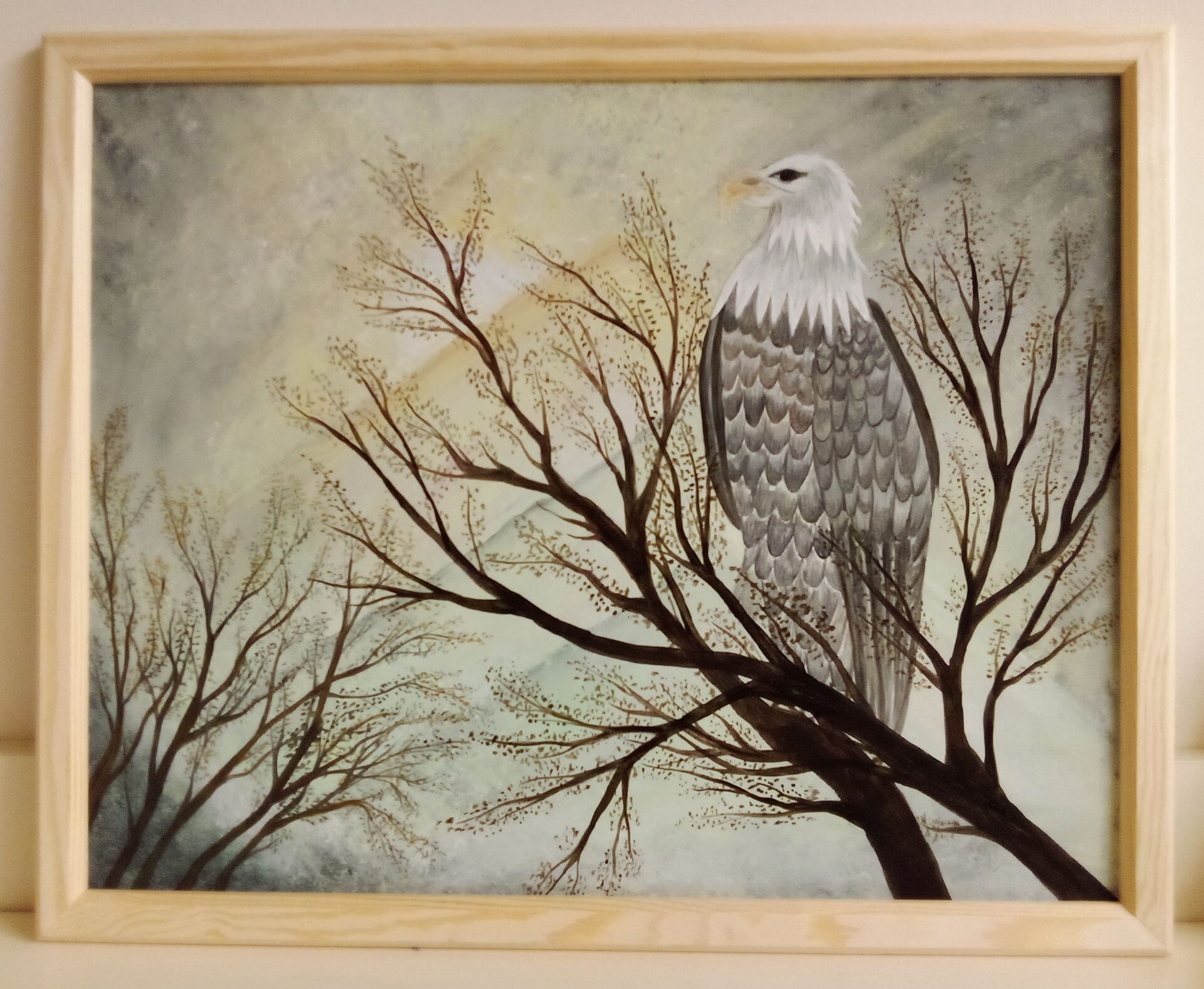 Obraz akrylowy na płycie malarskiej. Wymiary 40 x 50 cm. Oprawiony w naturalną, drewnianą, wąską ramę.