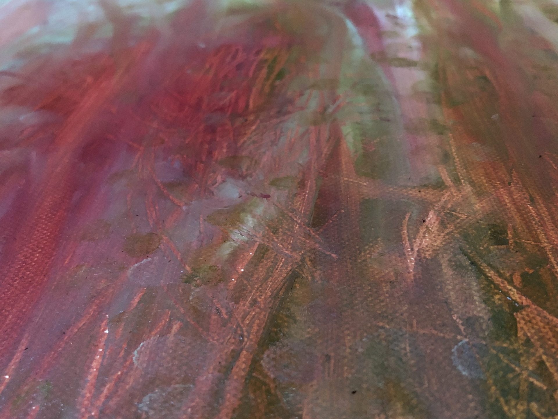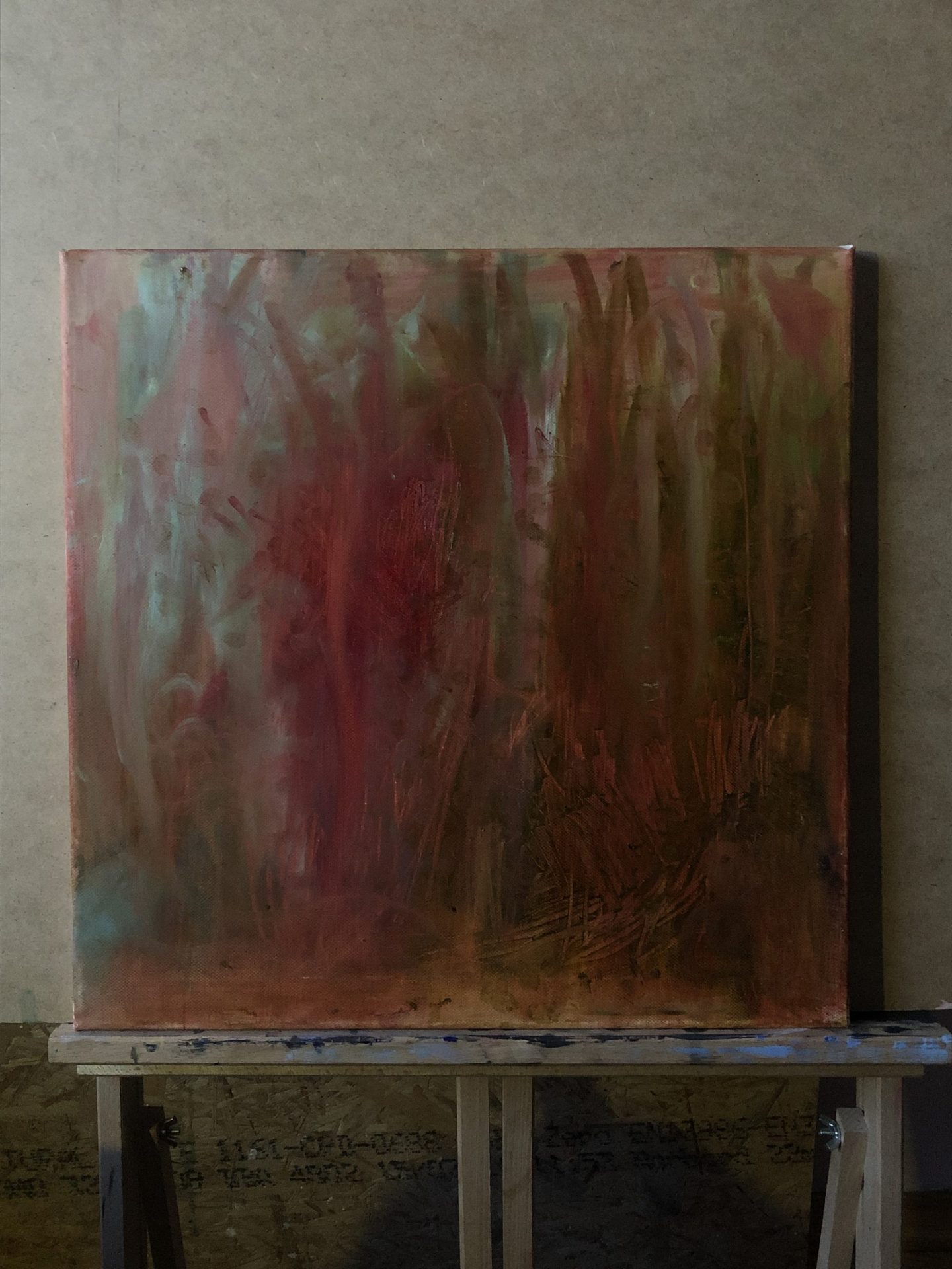 Podmalówka akrylem, zamalowana farbą olejną. Obraz tworzony w plenerze. Inspiracją była zmienność światła i pogody w lesie.