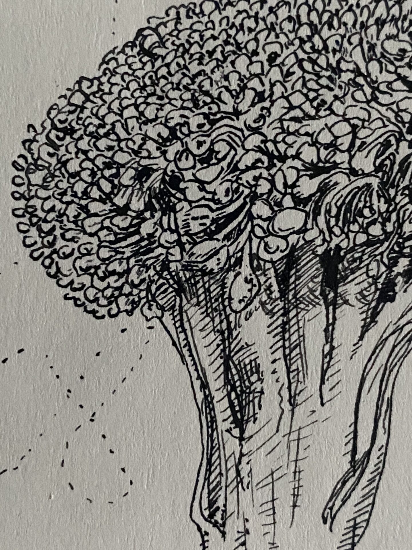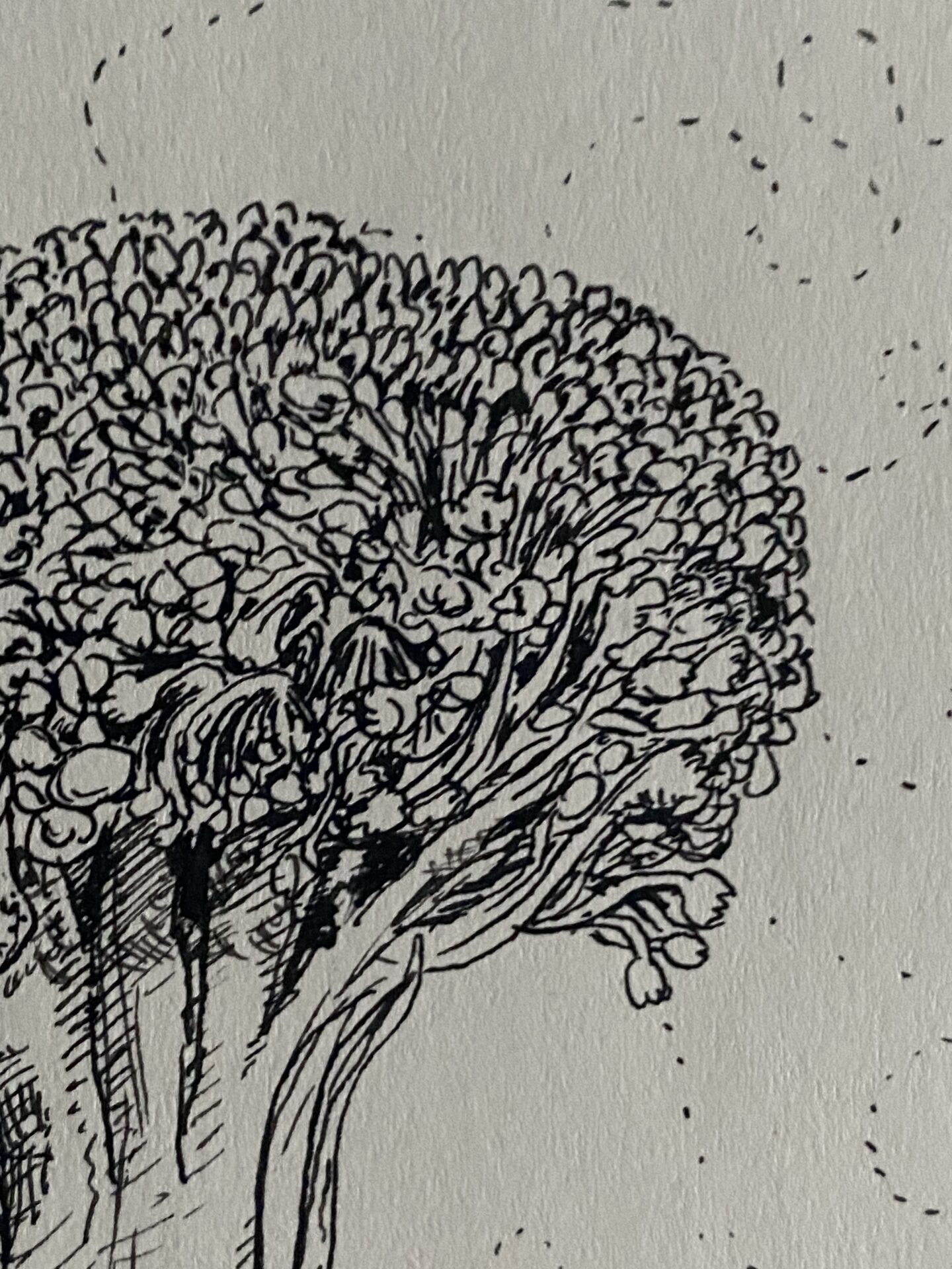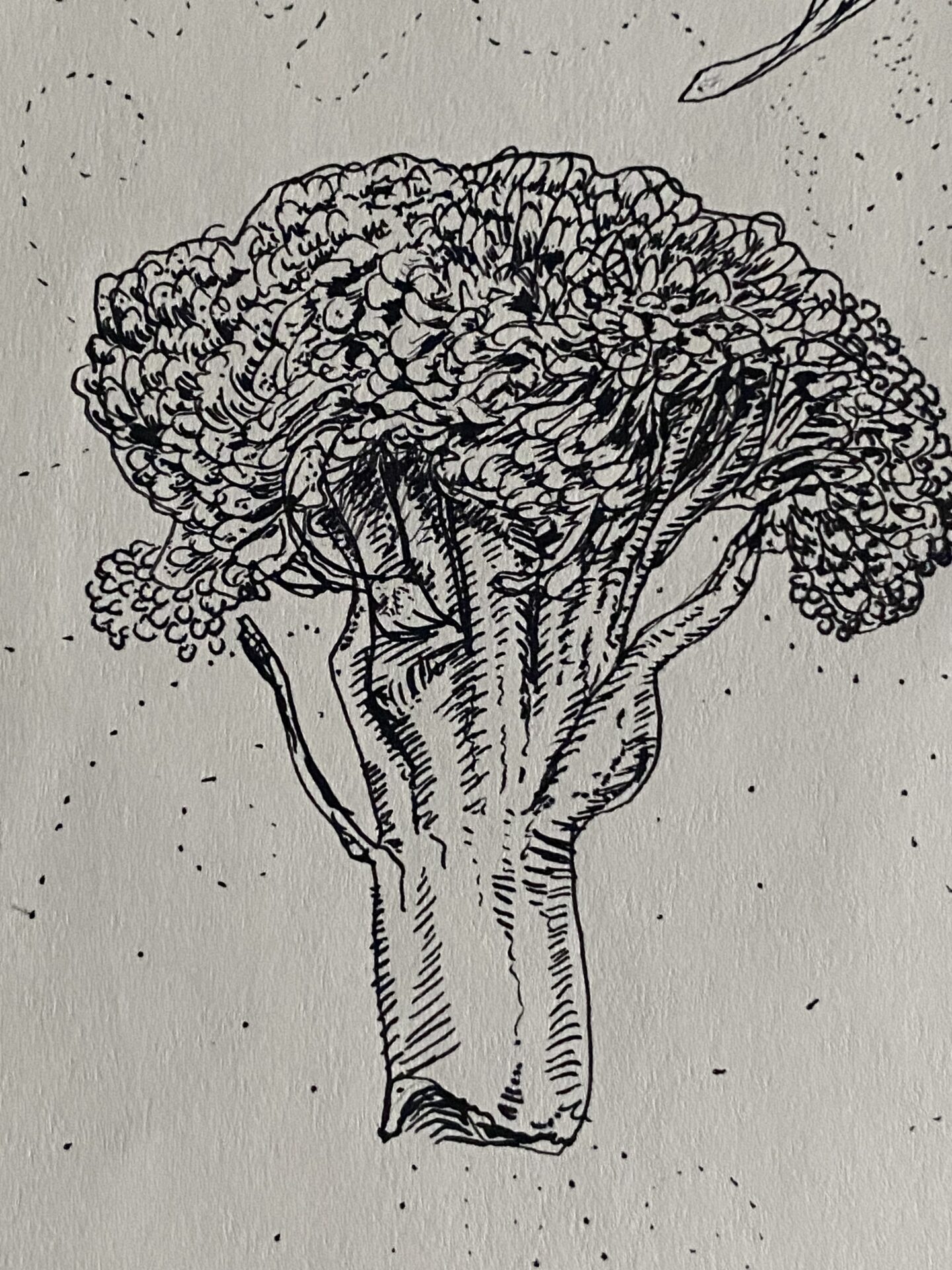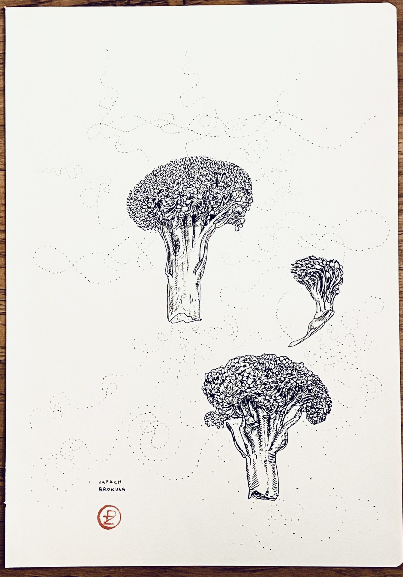 Rysunek piórkiem. Czarny tusz na papierze. Praca z cyklu „Przedmioty w ostrym świetle” . Praca sygnowana podpisem i stemplem.