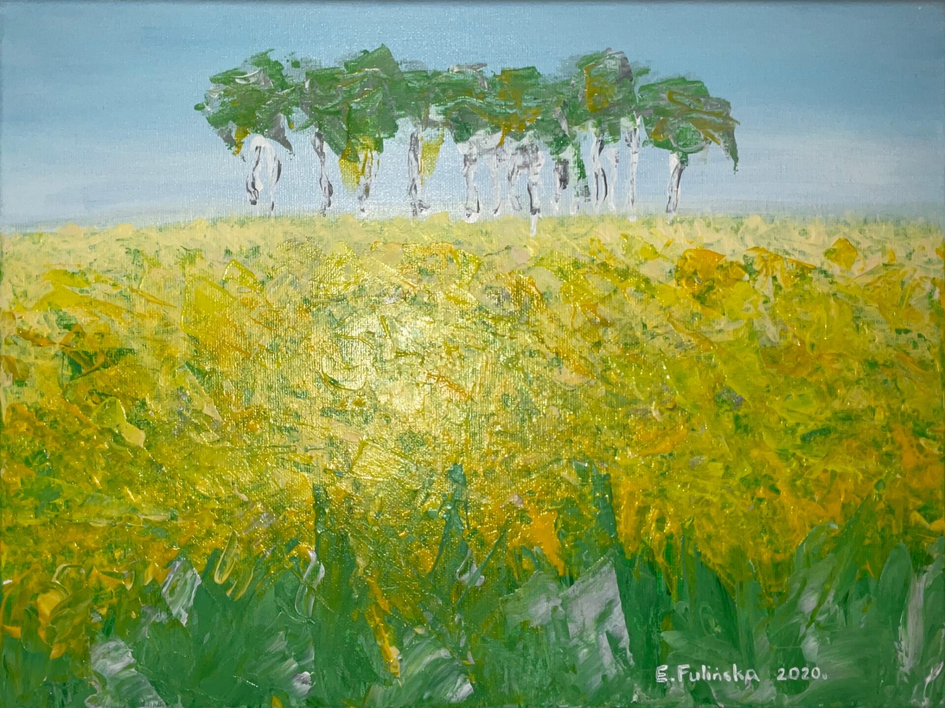 Obraz wykonany na płótnie, przy użyciu farb akrylowych, nakładanych szpachelką.