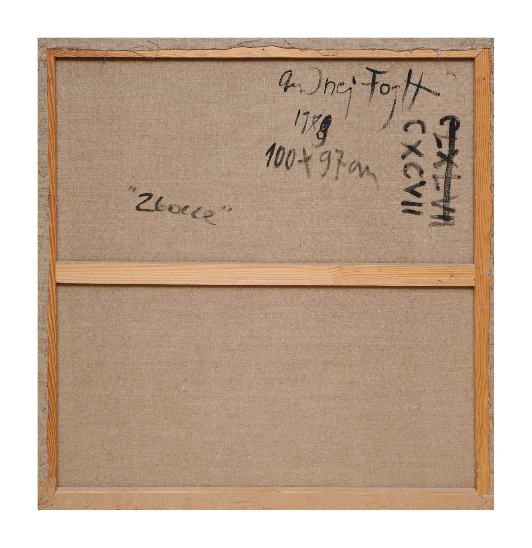 Na płótnie napis „Andrzej Fogtt 1989 100 x 97 cm Zbocze obok CLXLVII (przekreślone) CXCVII”