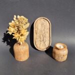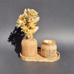Prezentuję wyjątkowy, ręcznie wykonany zestaw dekoracyjny z gipsu polimerowego, ozdobiony delikatnymi kwiatami oraz aromatyczną świecą, który wprowadzi do wnętrza niepowtarzalny klimat. Te unikalne kompozycje stanowią doskonały element dekoracyjny do każdego domu, dodając mu naturalnej elegancji.