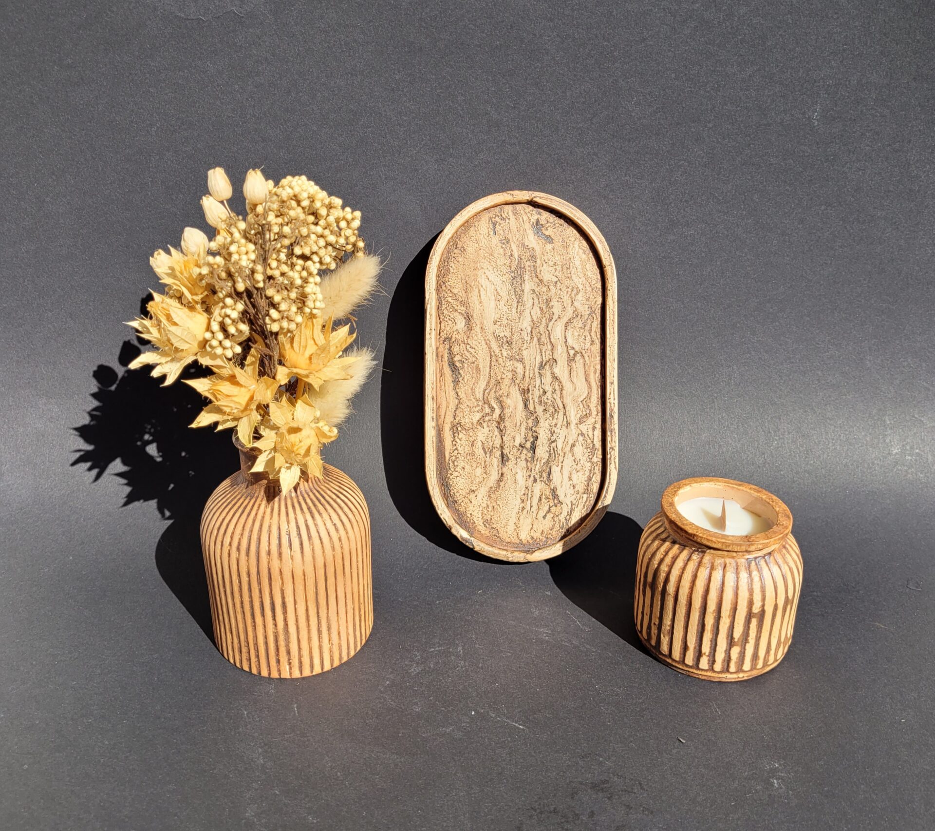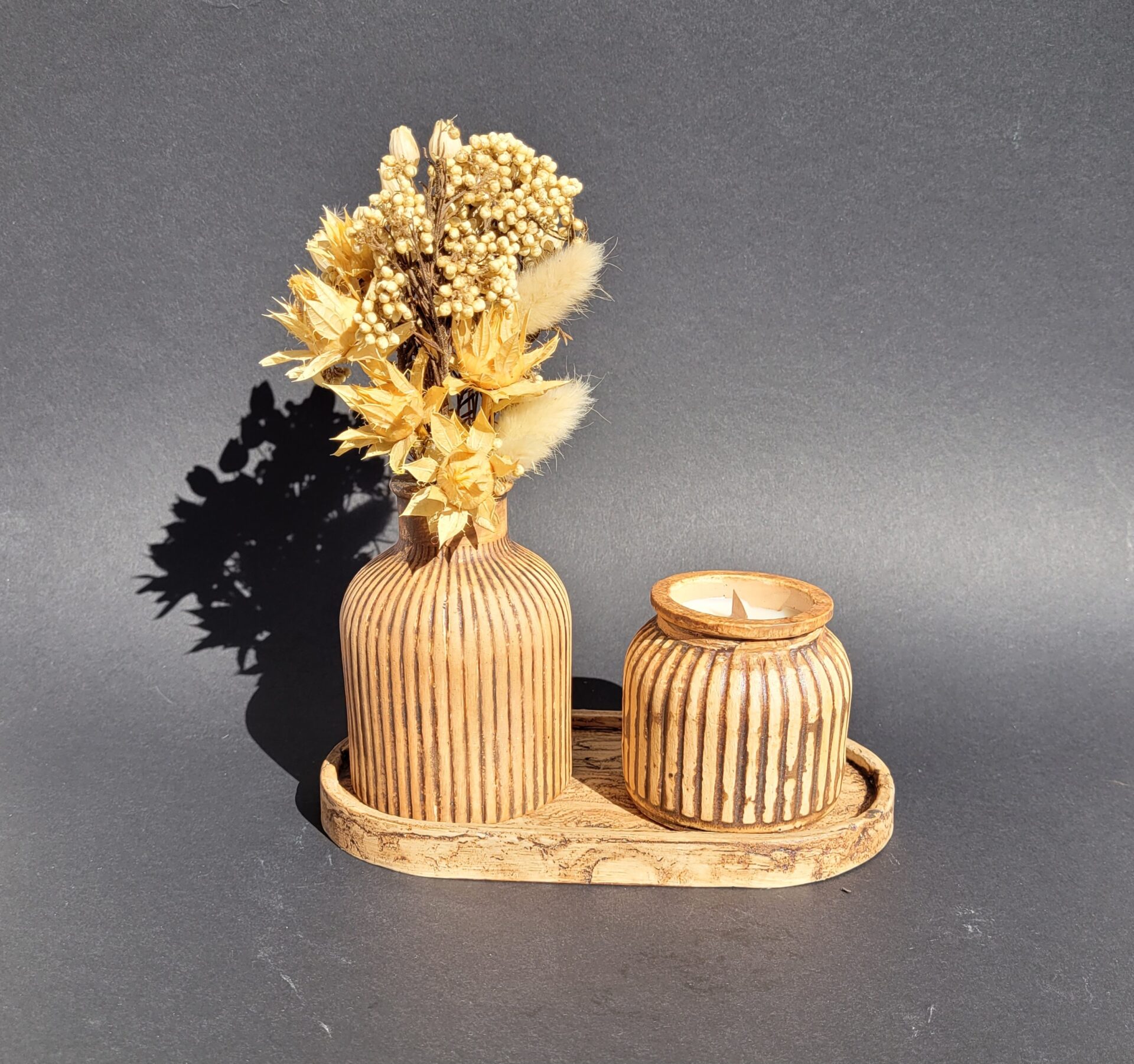 Prezentuję wyjątkowy, ręcznie wykonany zestaw dekoracyjny z gipsu polimerowego, ozdobiony delikatnymi kwiatami oraz aromatyczną świecą, który wprowadzi do wnętrza niepowtarzalny klimat. Te unikalne kompozycje stanowią doskonały element dekoracyjny do każdego domu, dodając mu naturalnej elegancji.