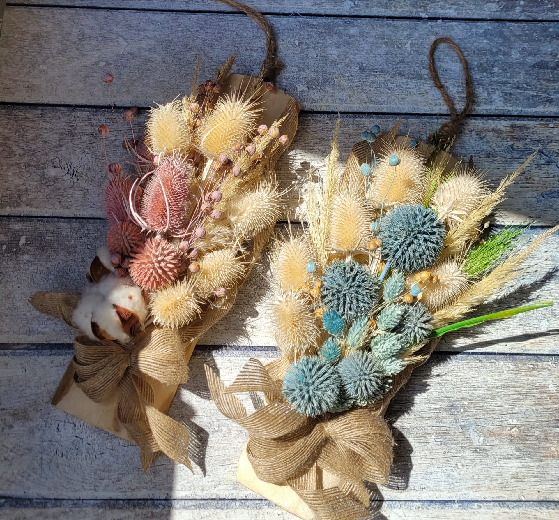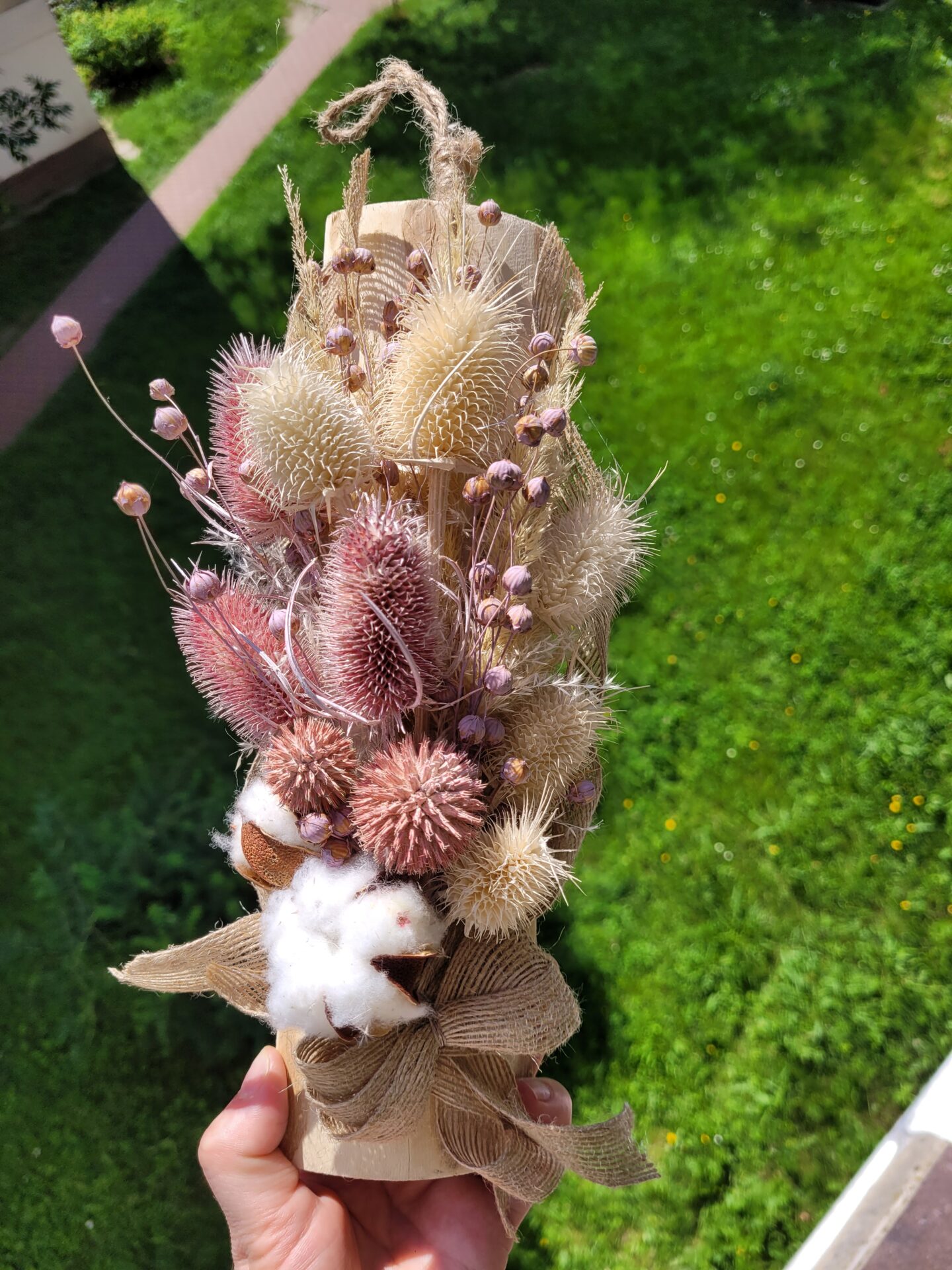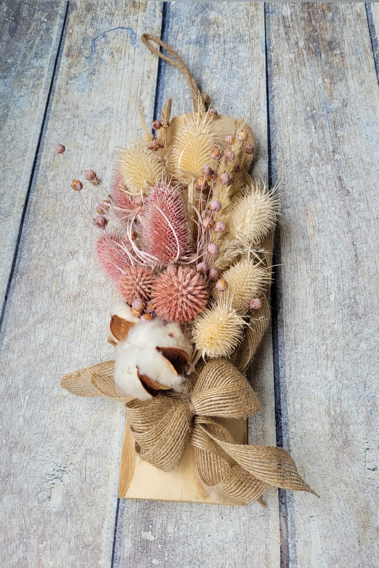 Ozdoba dla domu z suszonymi kwiatami wykonane na drewnianej desce.