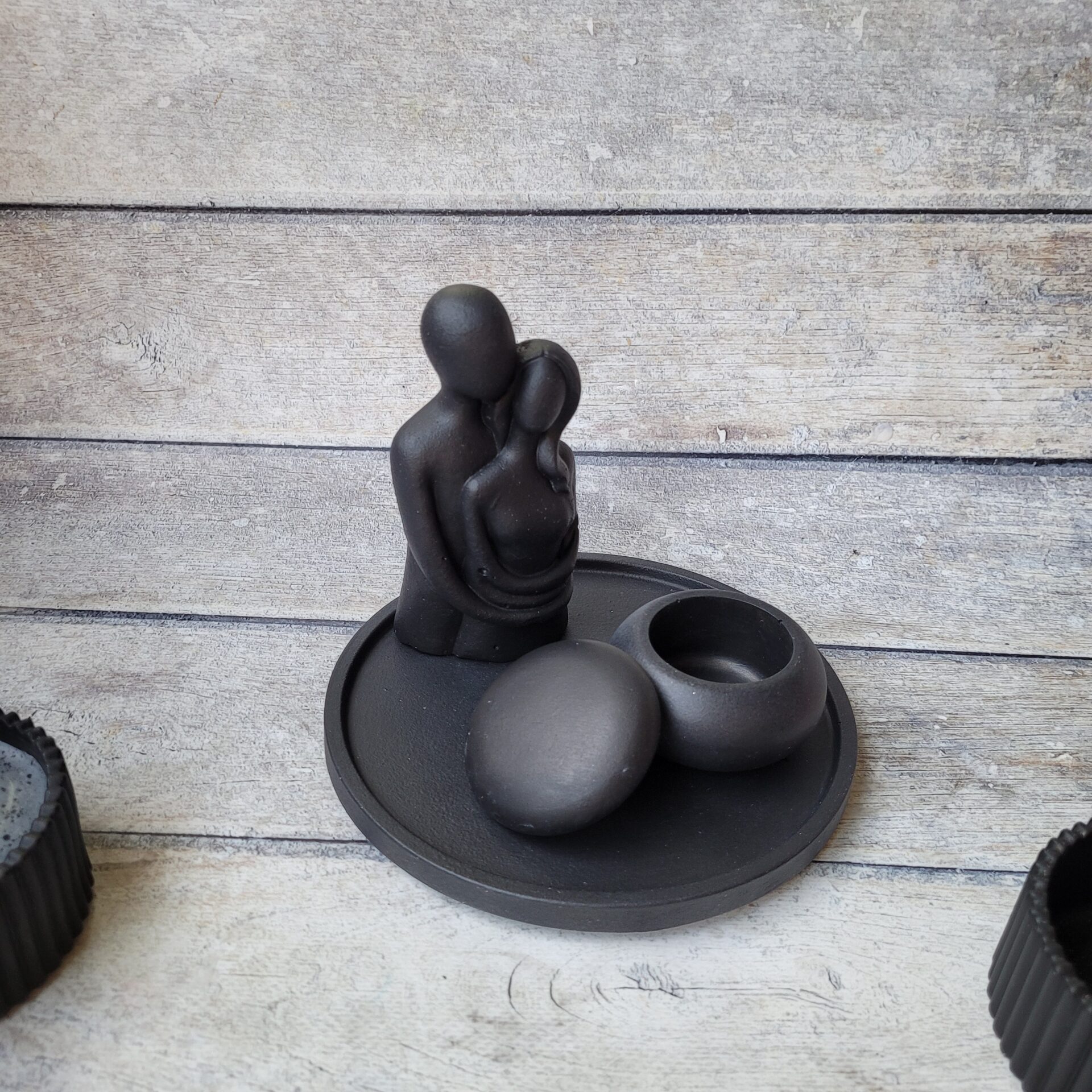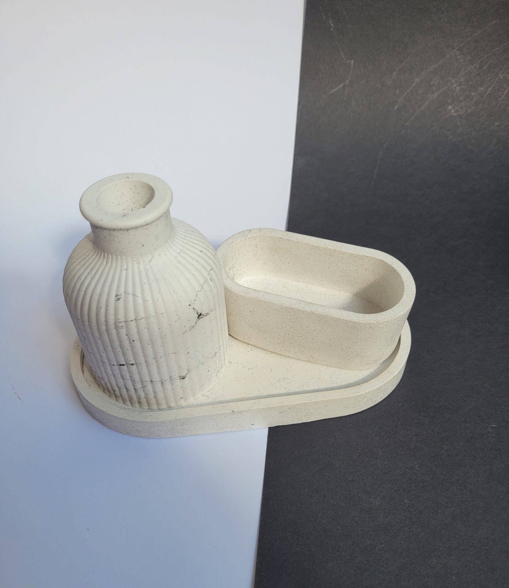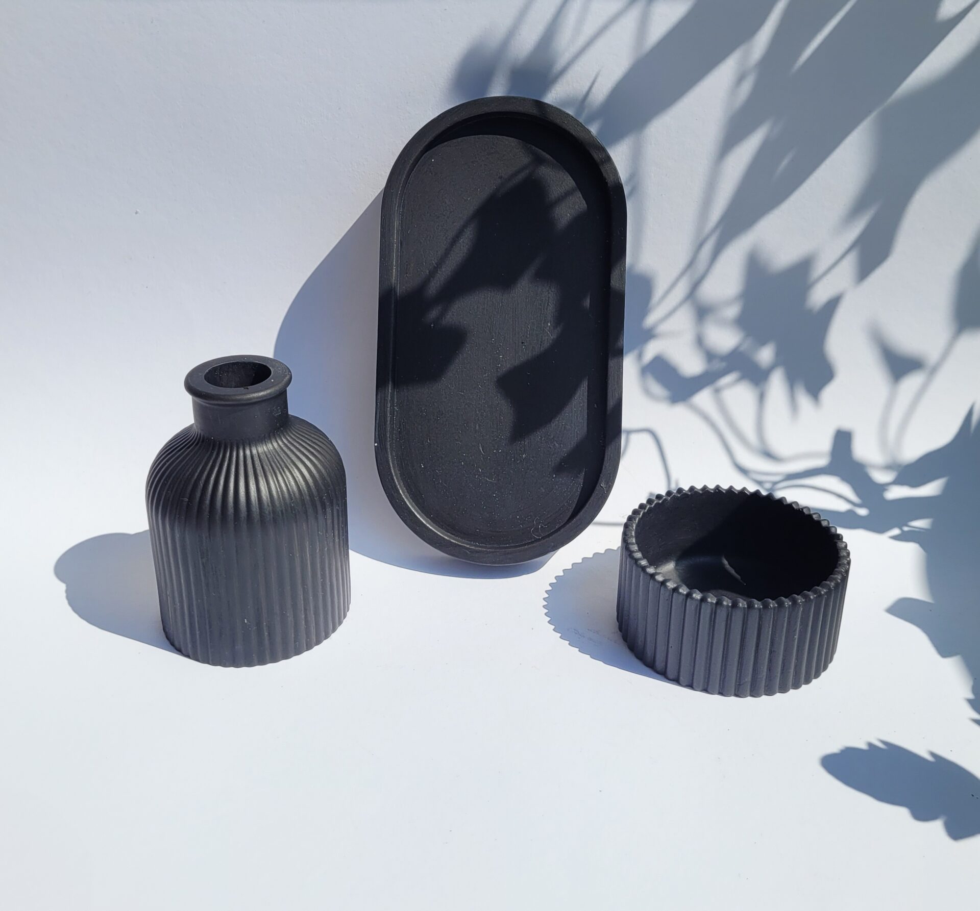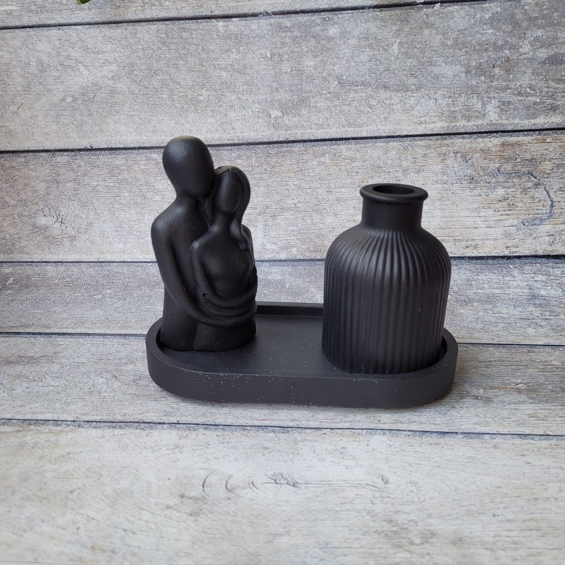 Odkryj wyjątkowy zestaw dekoracyjny stworzony ręcznie z gipsu polimerowego, który doda Twojemu wnętrzu elegancji i charakteru. Ten niepowtarzalny komplet w głębokim, czarnym kolorze składa się z owalnej podstawki, wazonika oraz uniwersalnej osłonki, która może pełnić funkcję stylowej świeczki lub eleganckiego pojemnika na biżuterię. Idealny na prezent lub jako wyjątkowy element dekoracyjny w Twoim domu. Każdy element został starannie wykonany z dbałością o detale, aby wprowadzić do Twojej przestrzeni odrobinę luksusu i nowoczesnego designu. Dodaj do koszyka już teraz i stwórz niepowtarzalną atmosferę w swoim wnętrzu!