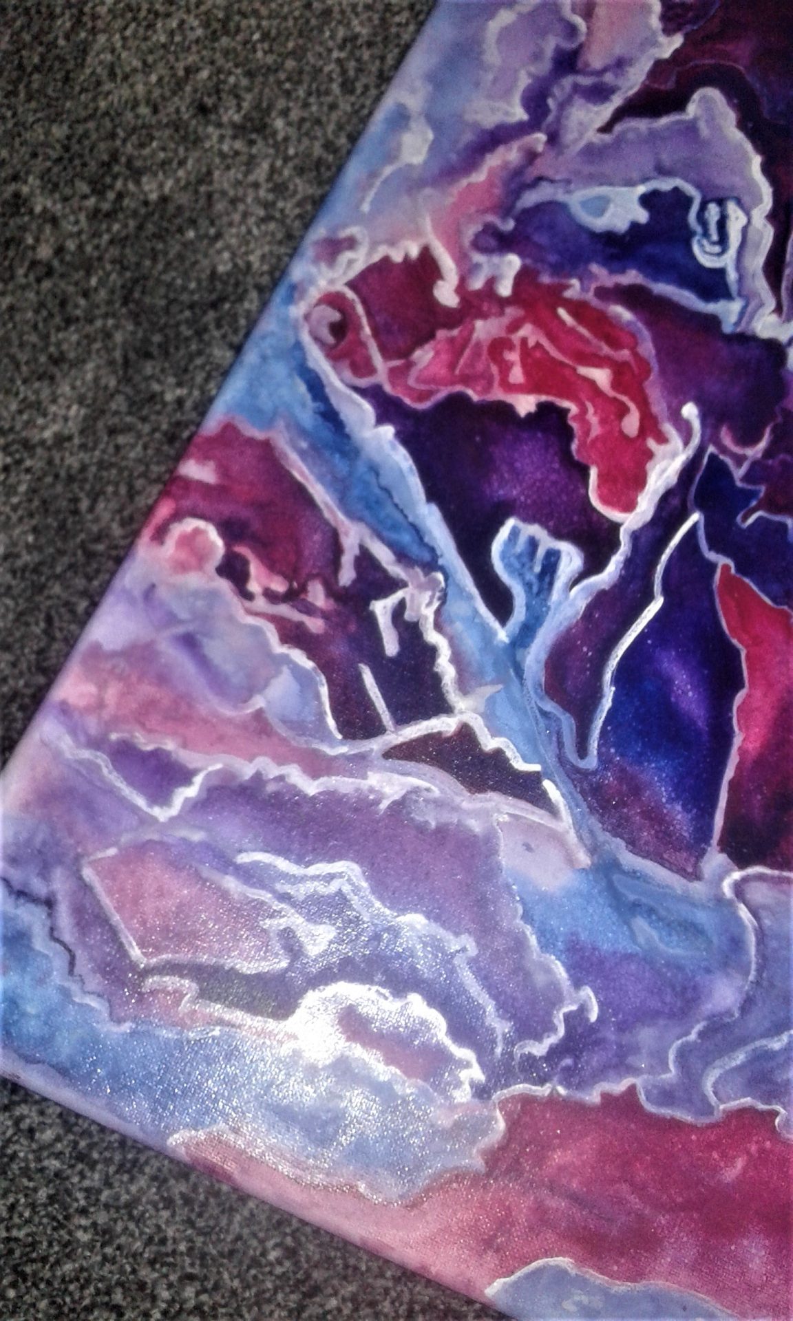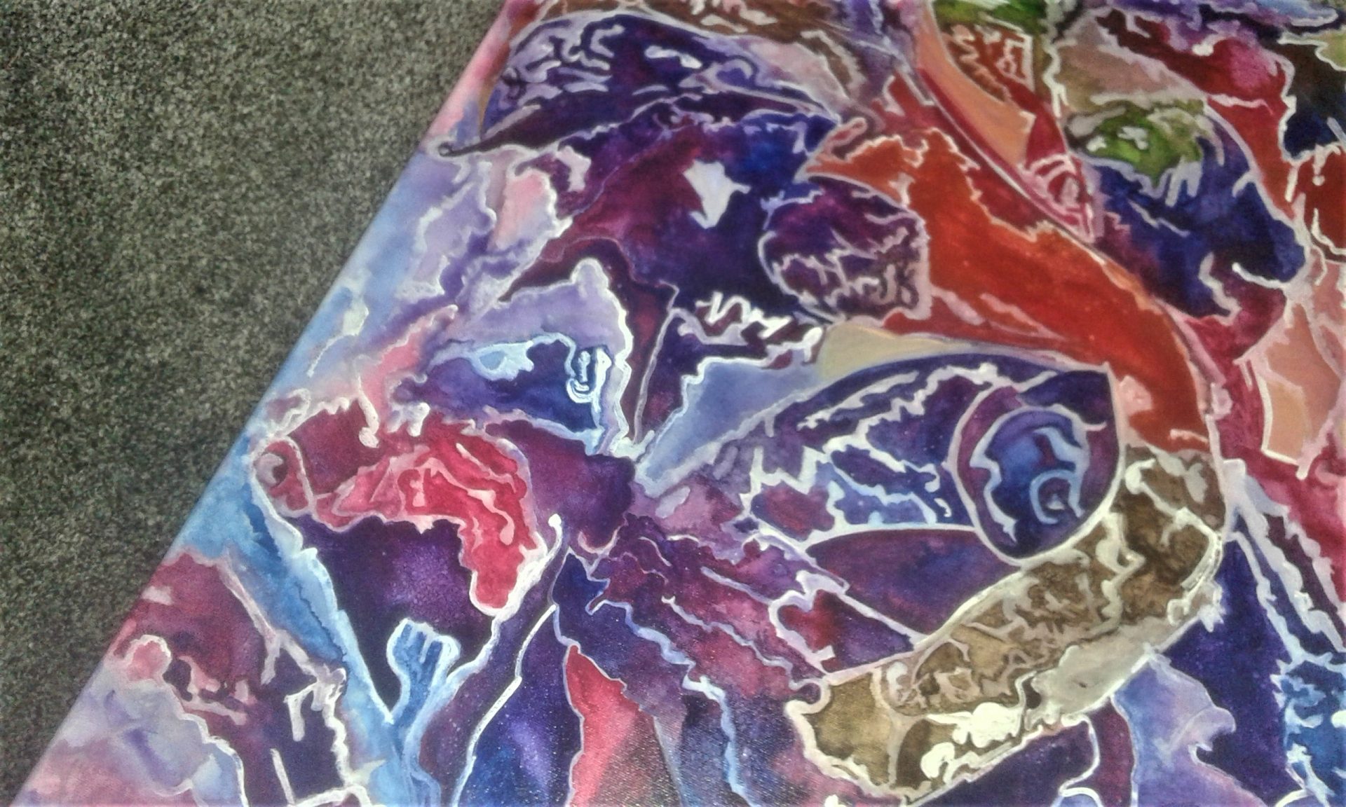 Obraz wykonany akwarelami na płótnie o wymiarach 70X50 cm. Obraz został zabezpieczony medium malarskim. Posiada również zamalowane boki.