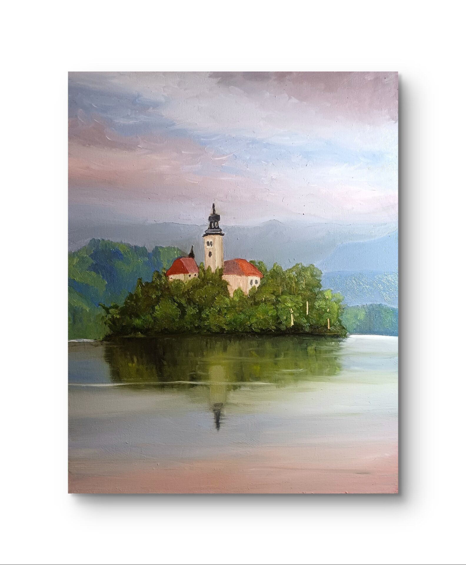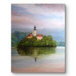 Piękny widok na słynną wyspę Blejski otok na malowniczym jeziorze bled z zamkiem w Słowenii.