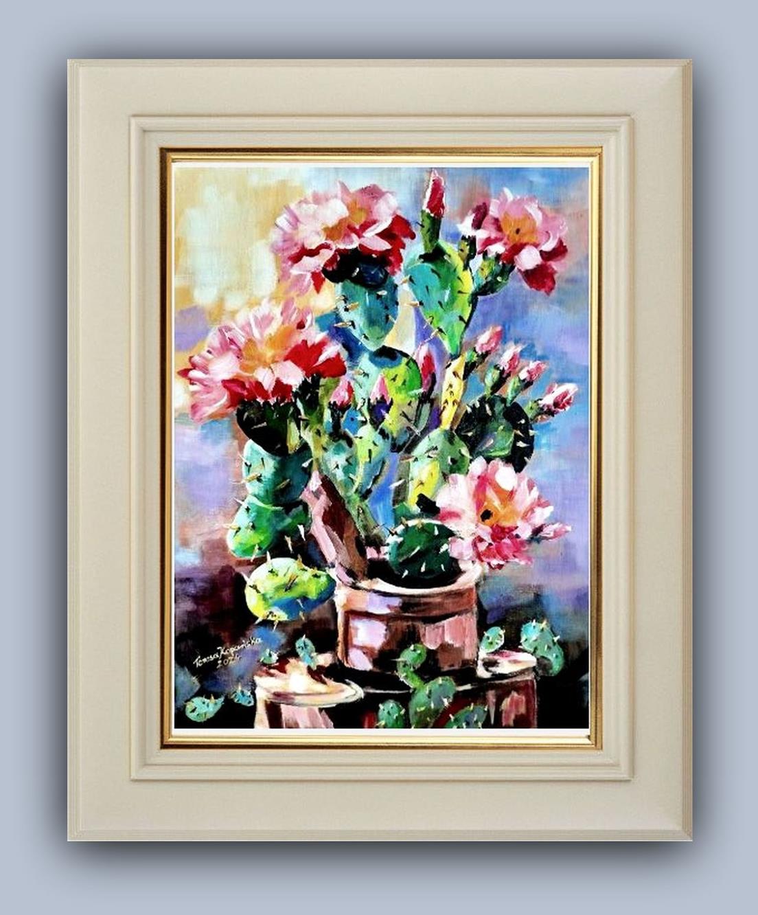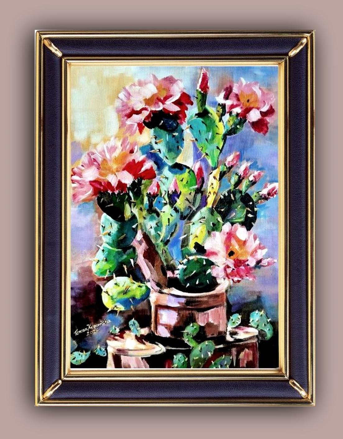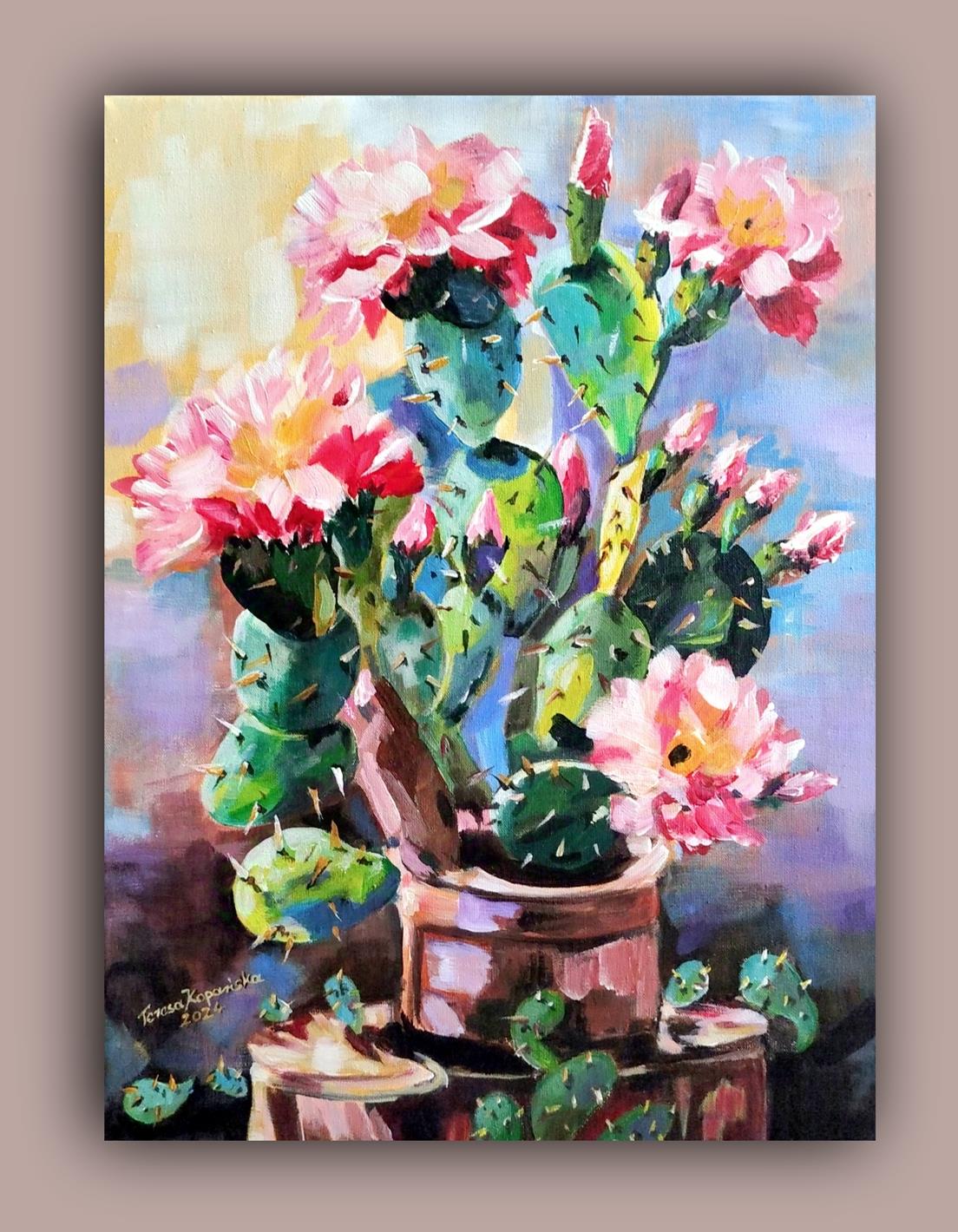 Przedmiotem sprzedaży jest obraz ” Zielony samotnik” stoi godnie w milczeniu. Malowany techniką: podłoże pod technikę olejną akrylowe – olejną na płótnie malarskim. Rok powstania obrazu 2024 Wymiary obrazu 30 cm x 41 cm bez ramy, ale ma zamalowane boki w kolorze tła płótna (obrazu) co wskazuje, że dzieło można zawieść na ścianie nawet bez ram. Zawieszony obraz na ścianie bez ram,nie traci na swoim pięknym wyglądzie. Obraz ” Zielony samotnik” jest zabezpieczony werniksem co oznacza jego długa żywotność i nie zniszczalność farb i kolorów. Wykonanie dzieła jest Teresa Kopańska artysta – malarz. Z przodu obrazu jest sygnatura malarki, również na odwrocie płótna. Serdecznie zapraszam do zakupu tego pięknego, kwiecistego kaktusa, który charakteryzuje się pięknym różowym kwiatem, któremu zazdrości nawet róża. Obraz przedstawiony jest do wglądu w wirtualnych ramach.