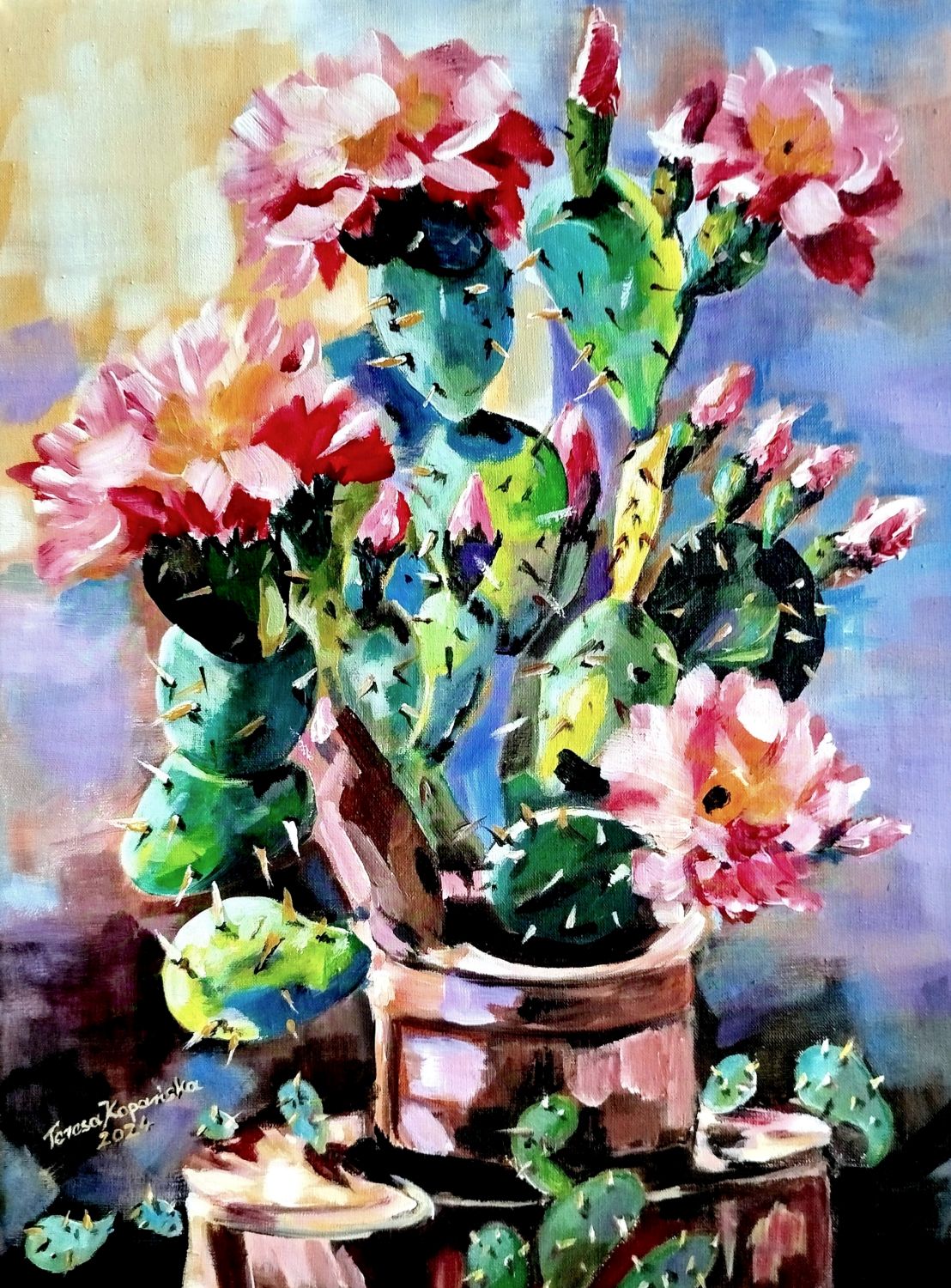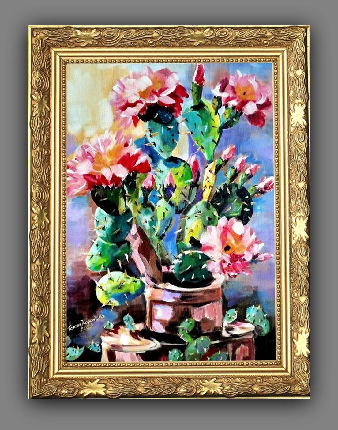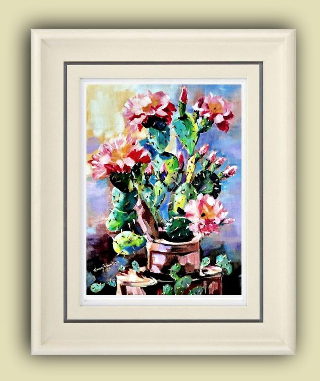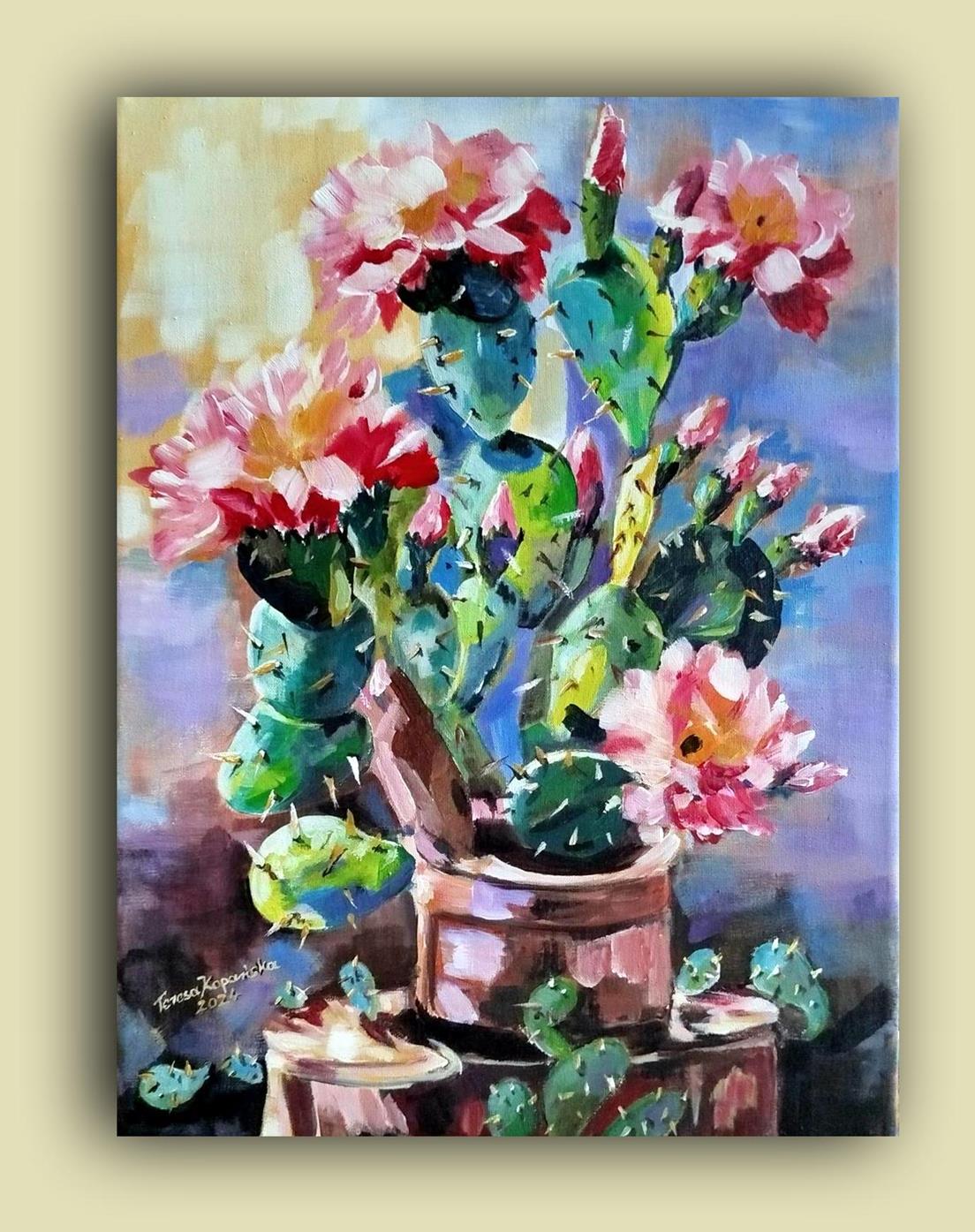 Przedmiotem sprzedaży jest obraz ” Zielony samotnik” stoi godnie w milczeniu. Malowany techniką: podłoże pod technikę olejną akrylowe – olejną na płótnie malarskim. Rok powstania obrazu 2024 Wymiary obrazu 30 cm x 41 cm bez ramy, ale ma zamalowane boki w kolorze tła płótna (obrazu) co wskazuje, że dzieło można zawieść na ścianie nawet bez ram. Zawieszony obraz na ścianie bez ram,nie traci na swoim pięknym wyglądzie. Obraz ” Zielony samotnik” jest zabezpieczony werniksem co oznacza jego długa żywotność i nie zniszczalność farb i kolorów. Wykonanie dzieła jest Teresa Kopańska artysta – malarz. Z przodu obrazu jest sygnatura malarki, również na odwrocie płótna. Serdecznie zapraszam do zakupu tego pięknego, kwiecistego kaktusa, który charakteryzuje się pięknym różowym kwiatem, któremu zazdrości nawet róża. Obraz przedstawiony jest do wglądu w wirtualnych ramach.