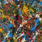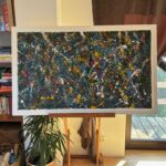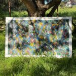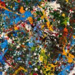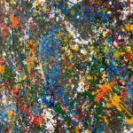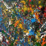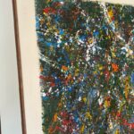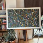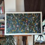 Obraz strukturalny o wymiarach 130×80 cm. Na strukturalnym ciemnym zielonym tle, szaleństwo kolorów.
