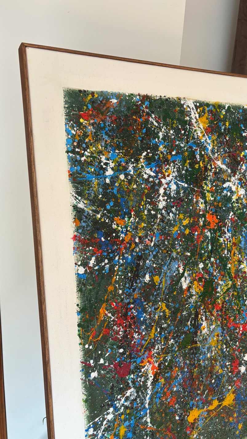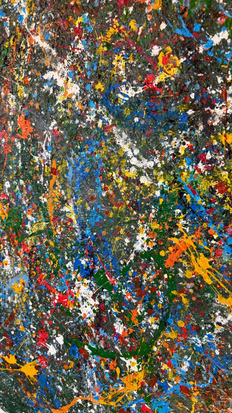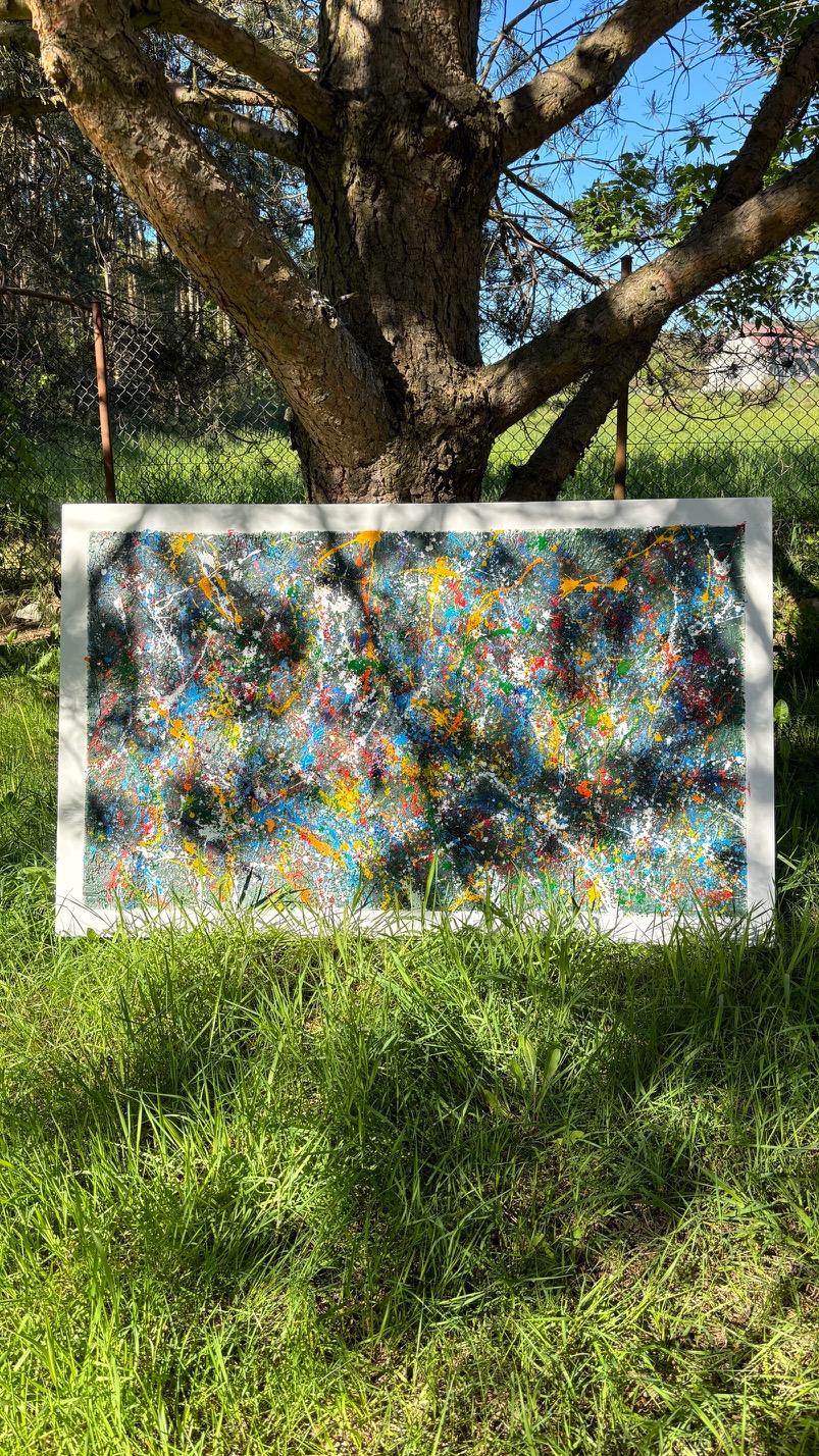 Obraz strukturalny o wymiarach 130×80 cm. Na strukturalnym ciemnym zielonym tle, szaleństwo kolorów.