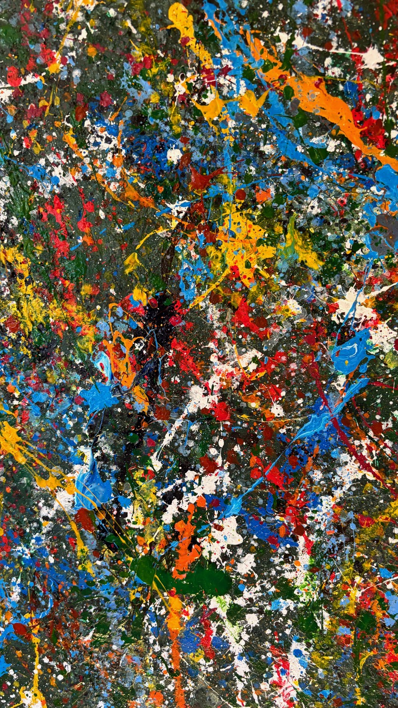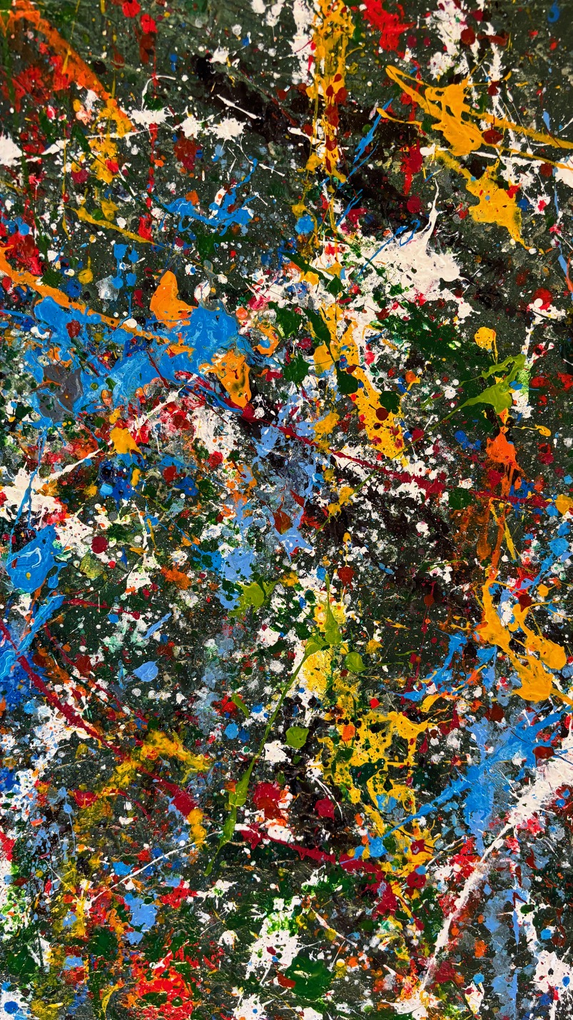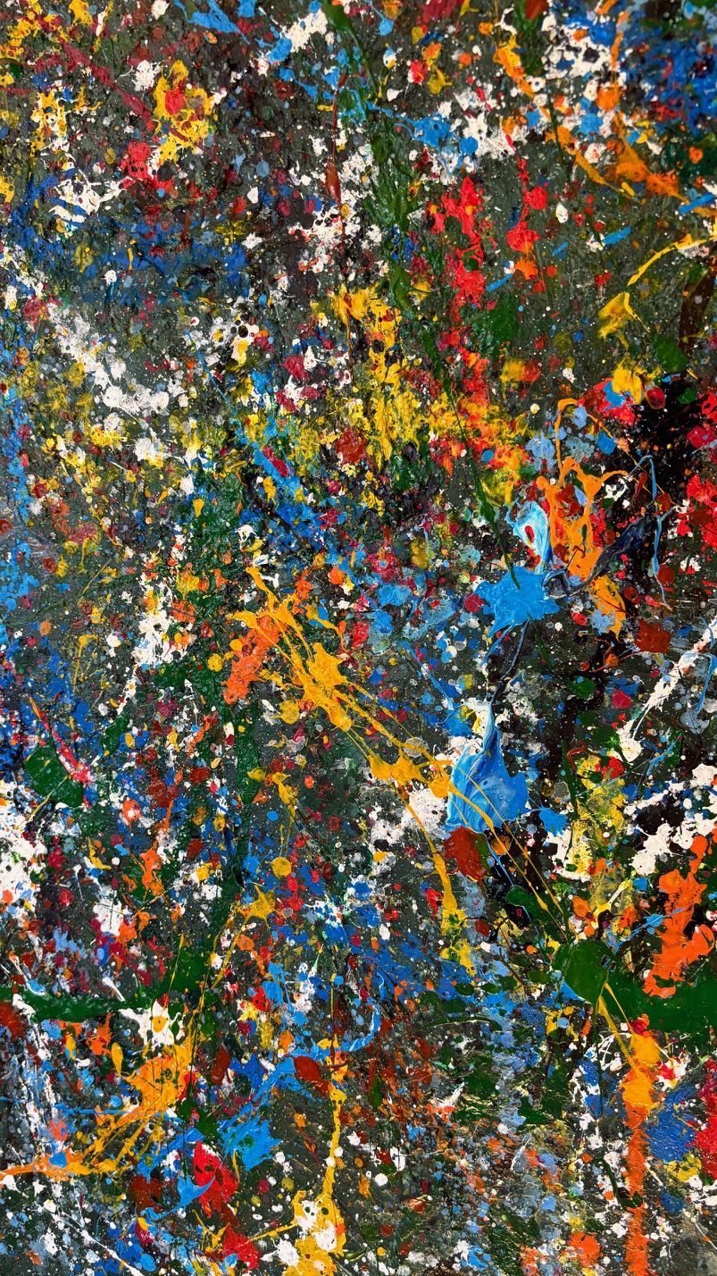 Obraz strukturalny o wymiarach 130×80 cm. Na strukturalnym ciemnym zielonym tle, szaleństwo kolorów.