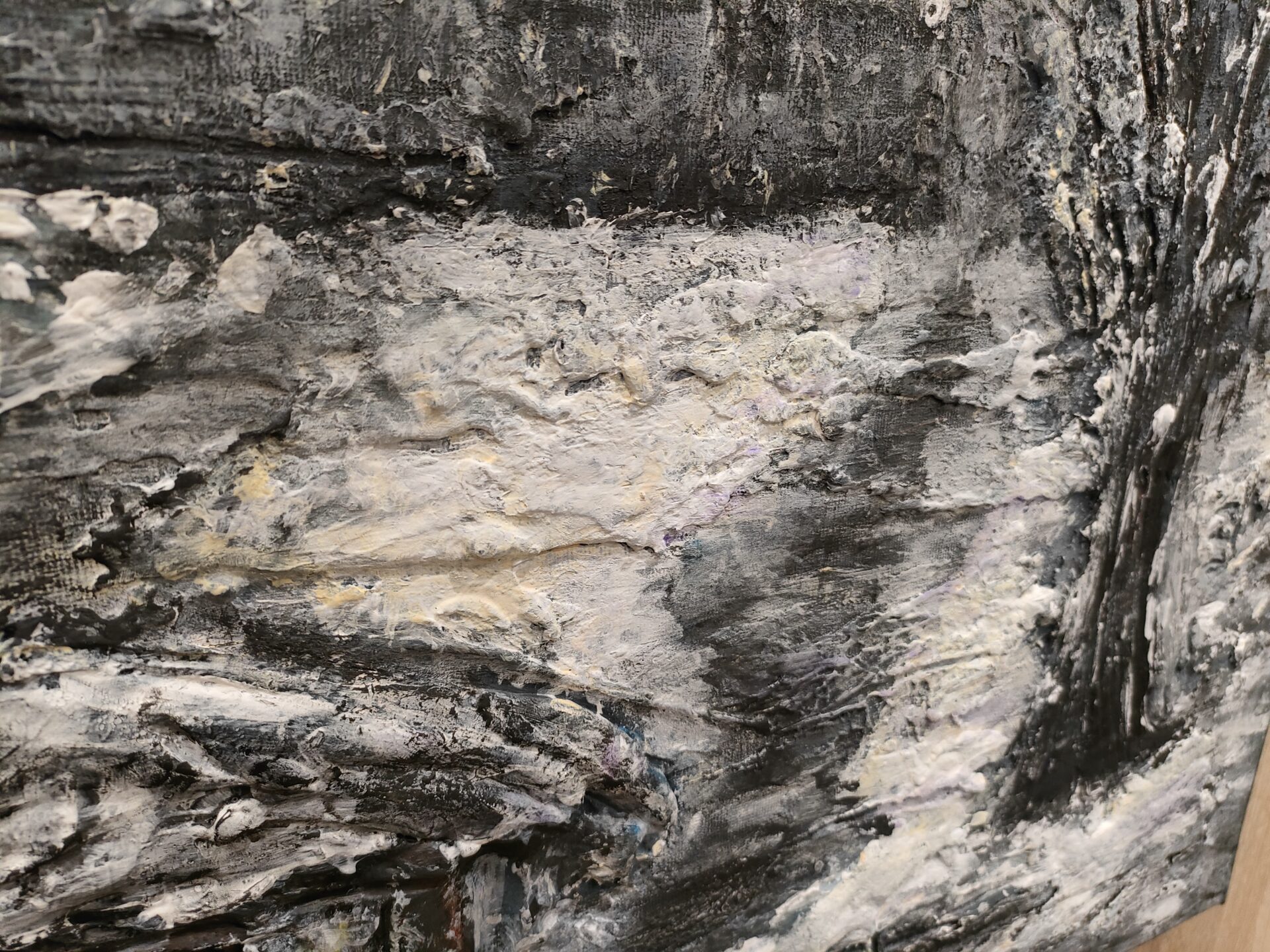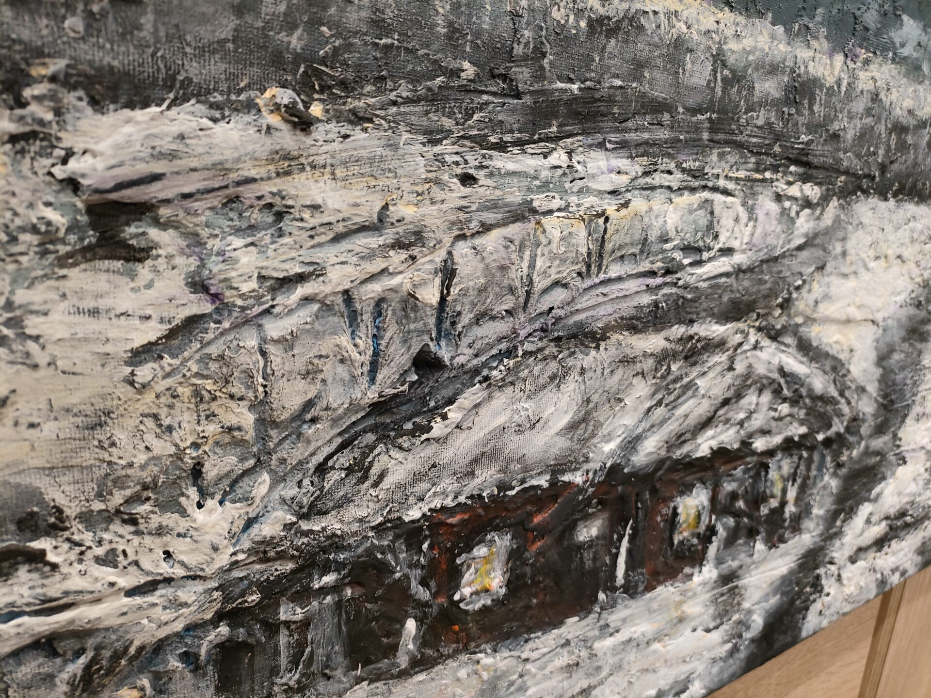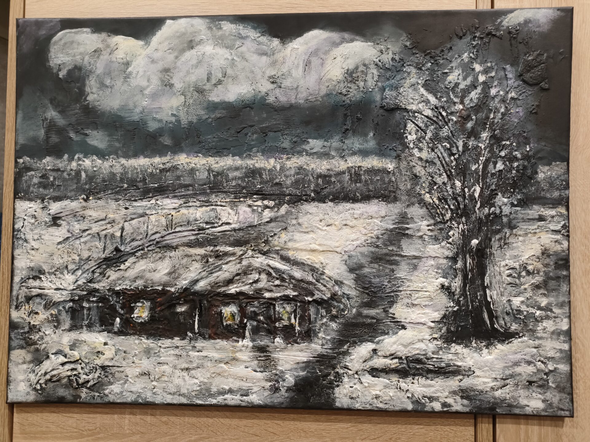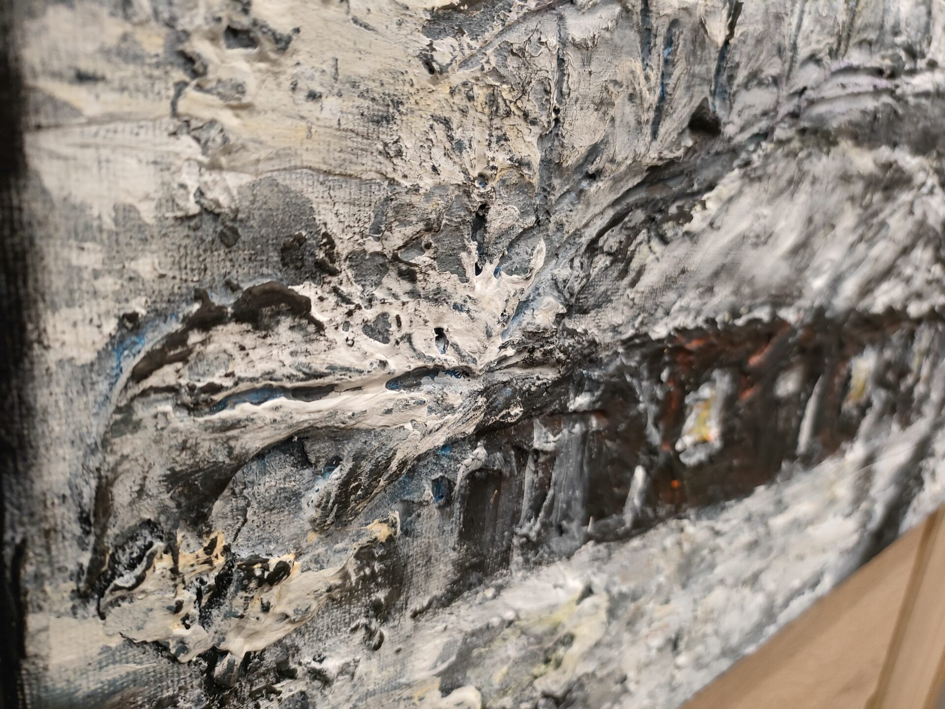 Obraz strukturalny, namalowany farbami akrylowymi, zabezpieczony podwójną warstwą ochronną lakieru.
