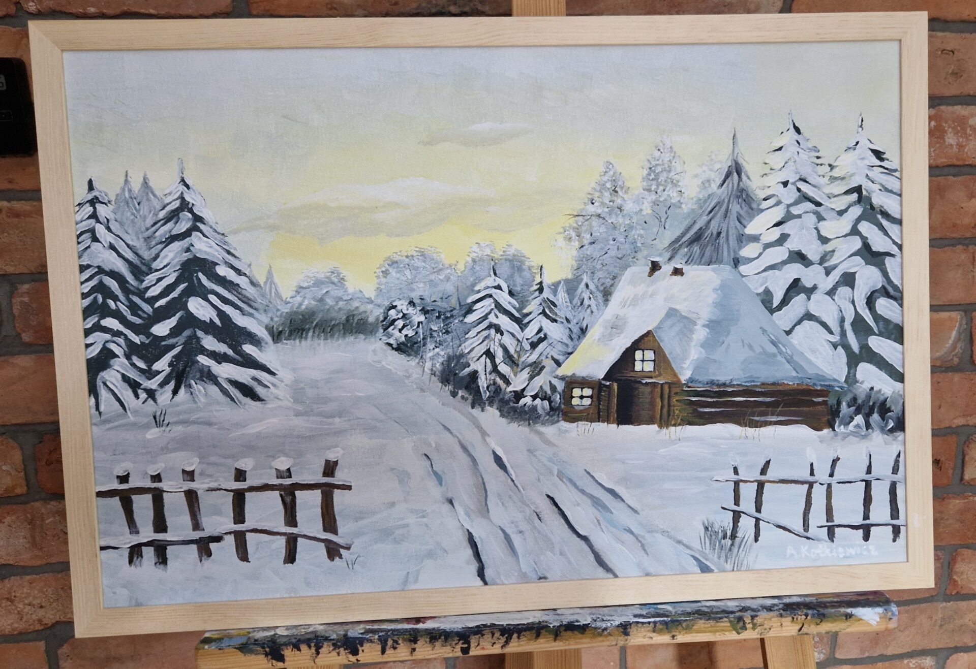 Tytuł obrazu: „zima” Wymiary: 40×60 Technika: akryl Ramka : naruralne drewno Autor: Aleksandra