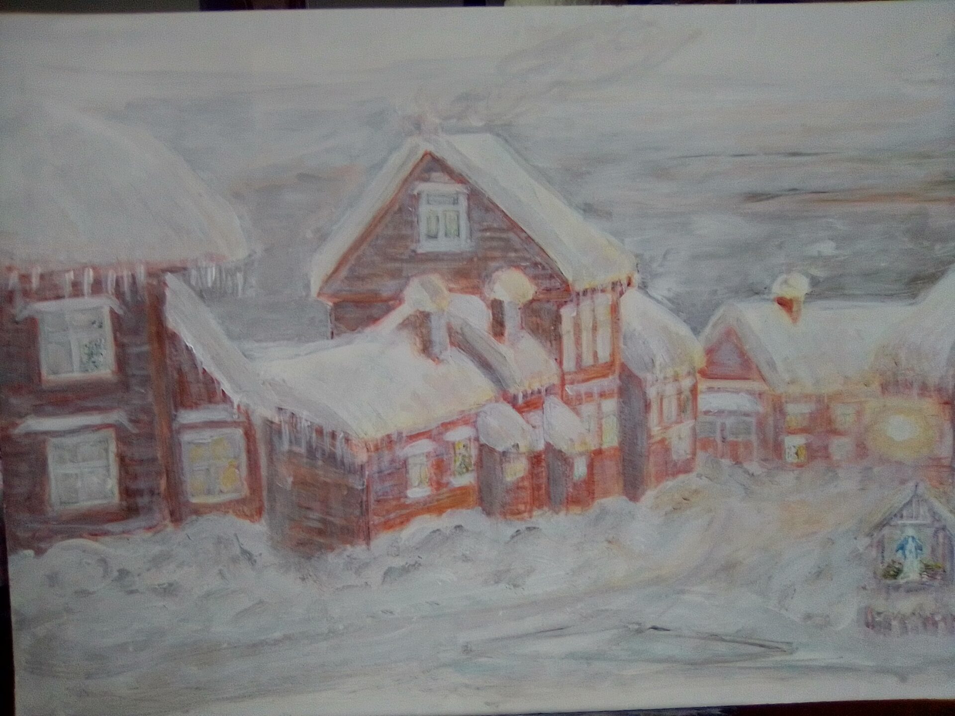 Zima. Miasteczko zimową porą o świcie. Pianka 5 mm z obustronnie wklejonym brystolem. Akryl 100 cm x 70 cm. Do oprawienia w ramę lub antyramę.