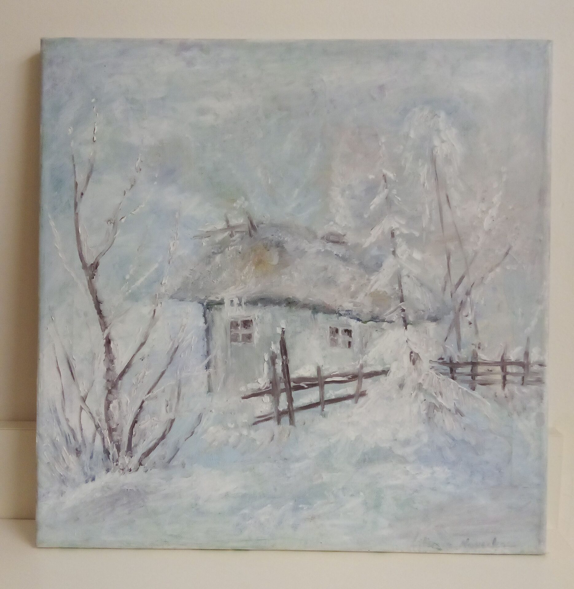 Obraz olejny na płótnie. Wymiary 40 cm x 40 cm. Inspirowany małą, wiejską chatą górską napotkaną podczas wędrówek w okolicach pogranicza polsko- czeskiego.