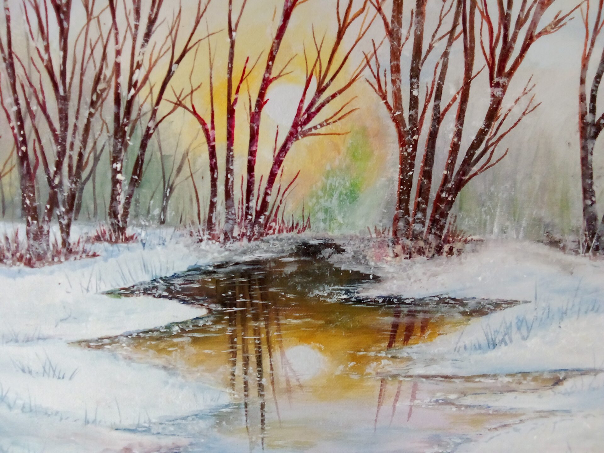 Obraz malowany farbami akrylowymi na płycie malarskiej. Wymiar: 40 x 50 cm. Klasyczna zima- z pewnością wpasuje się w każde wnętrze. Obraz oprawiony w drewnianą, naturalną ramę- gotowy do powieszenia.