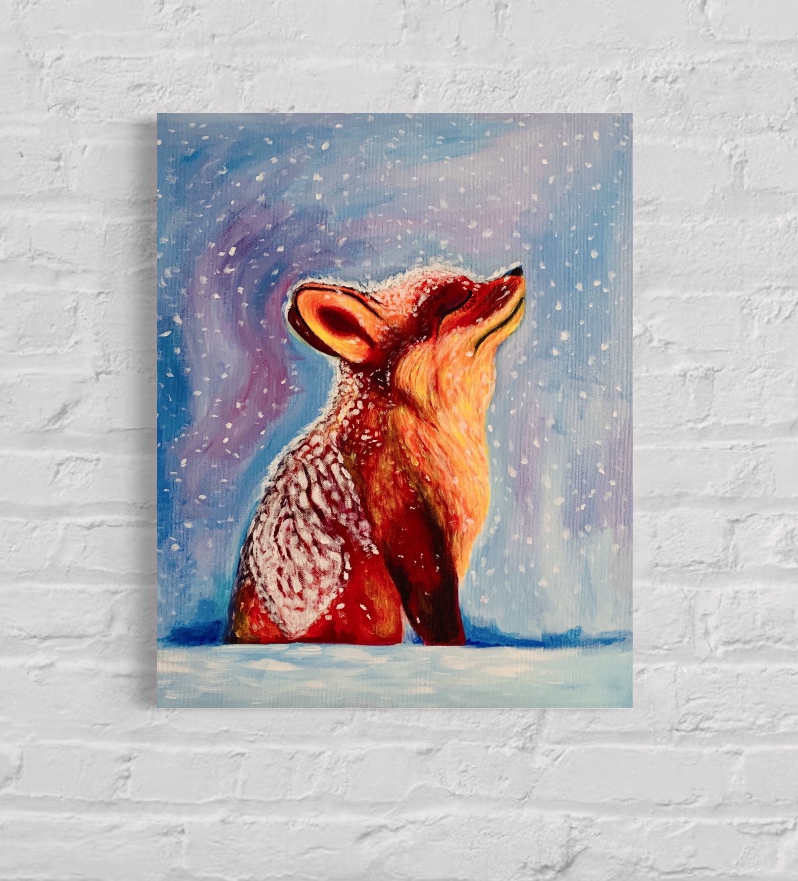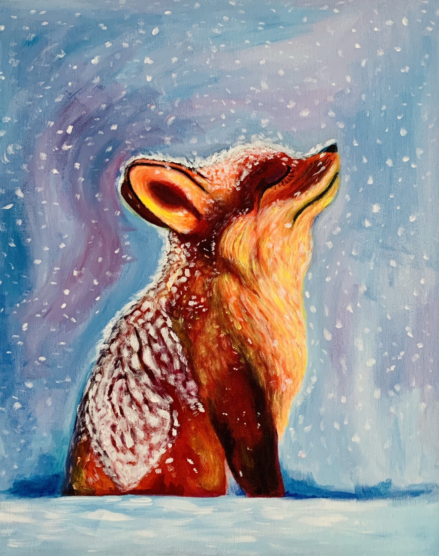 Obraz Zimowego liska malowany ręcznie akrylami na płótnie. Wymiary – 40 x 50 cm