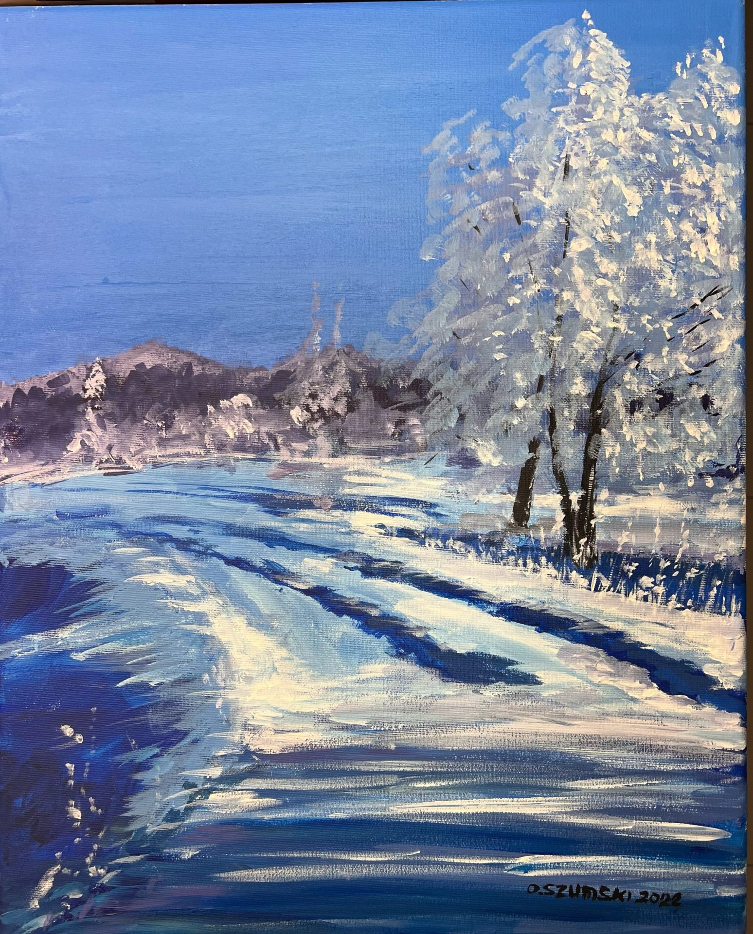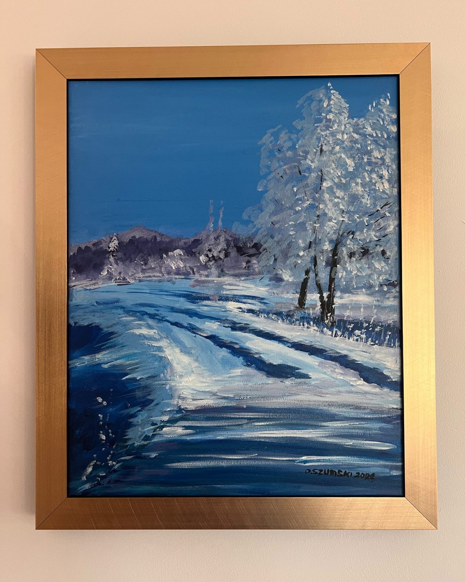 Obraz akrylowy na podobraziu bawełnianym, oprawiony w ramę w kolorze złotego szampana.