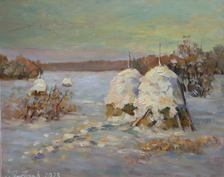 Obraz olejny na podobraziu płóciennym w technice alla prima z widoczną fakturą farby