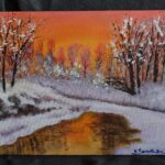 Widok przedstawia pejzaż mroźnej zimy na tle ciepłego zachodu słońca , odbijającego się w zamarzniętym jeziorze.Ośnieżone białym śniegiem drzewa uginają się pod jego ciężarem. Zastosowane przez autora barwy nadają równowagę pomiędzy zimnem i ciepłem.Powalone drzewo przedstawia „ciężar” codziennych trosk, które potrafią „przygnieść i powalić”
