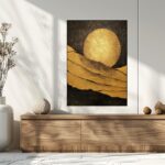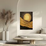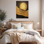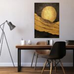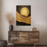 Złota Abstrakcja, akryl na płótnie o wymiarach 60 x 80. Kontrast między złotymi elementami, a czarnym tłem tego obrazu ukazuje minimalistyczną estetykę, prostotę, a jednocześnie głębię abstrakcyjnego przekazu… Te kolory i abstrakcyjna forma obrazu nadadzą każdemu pomieszczeniu eleganckiego charakteru.