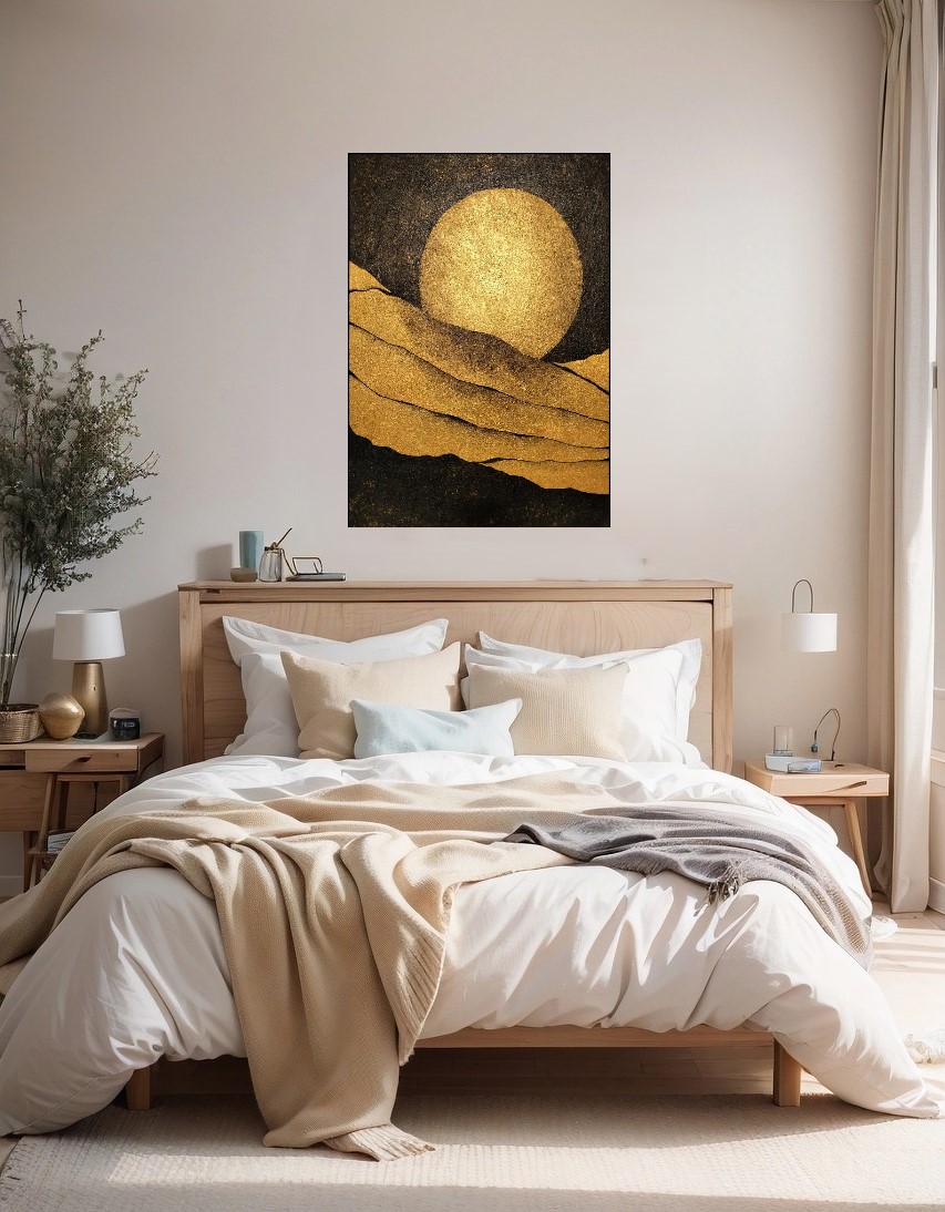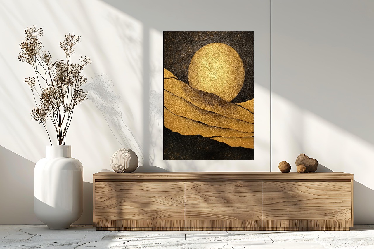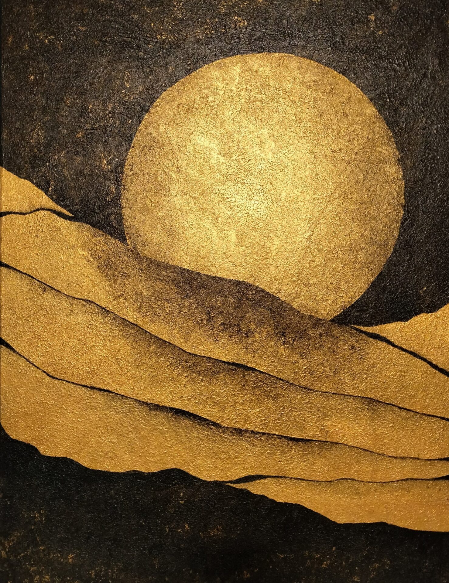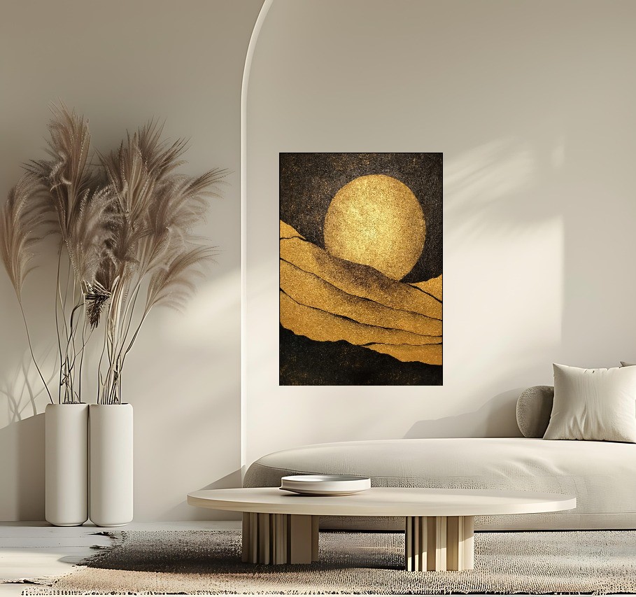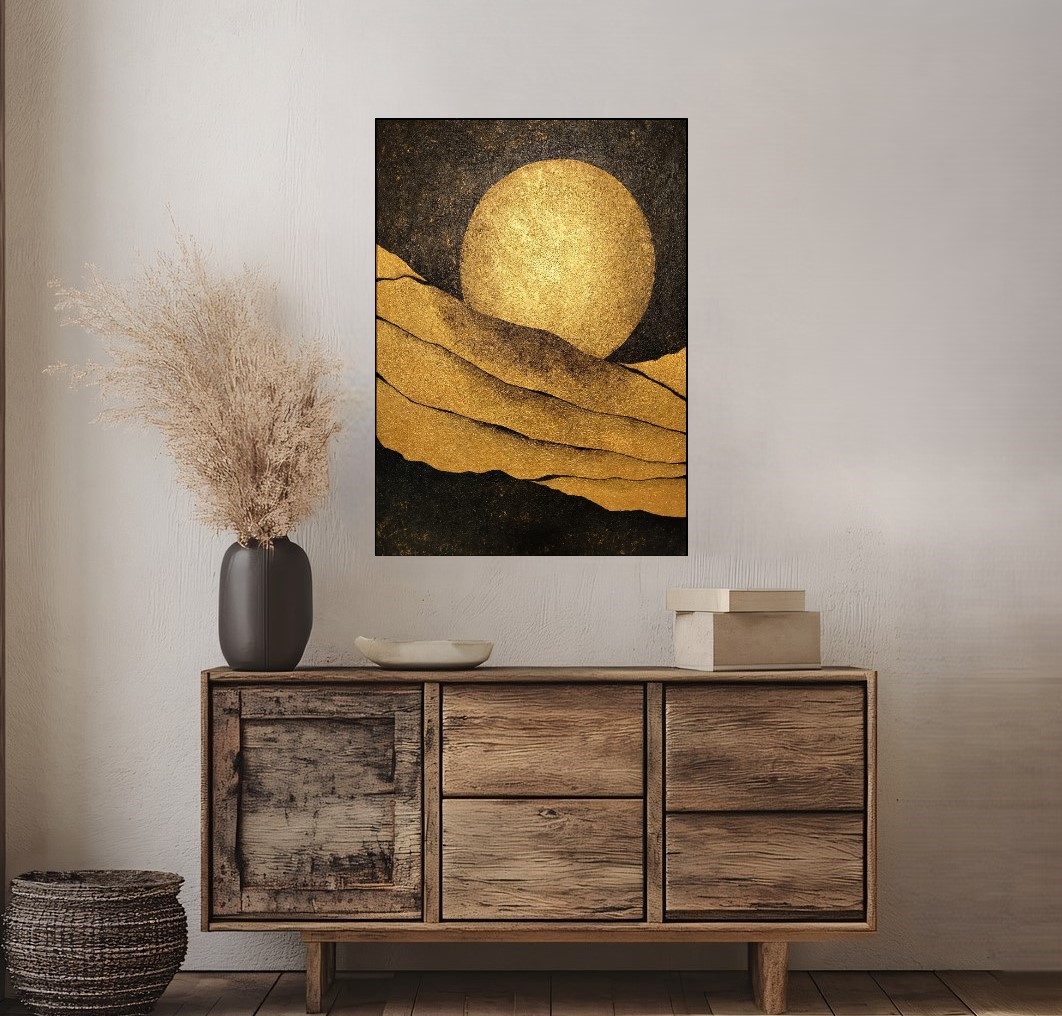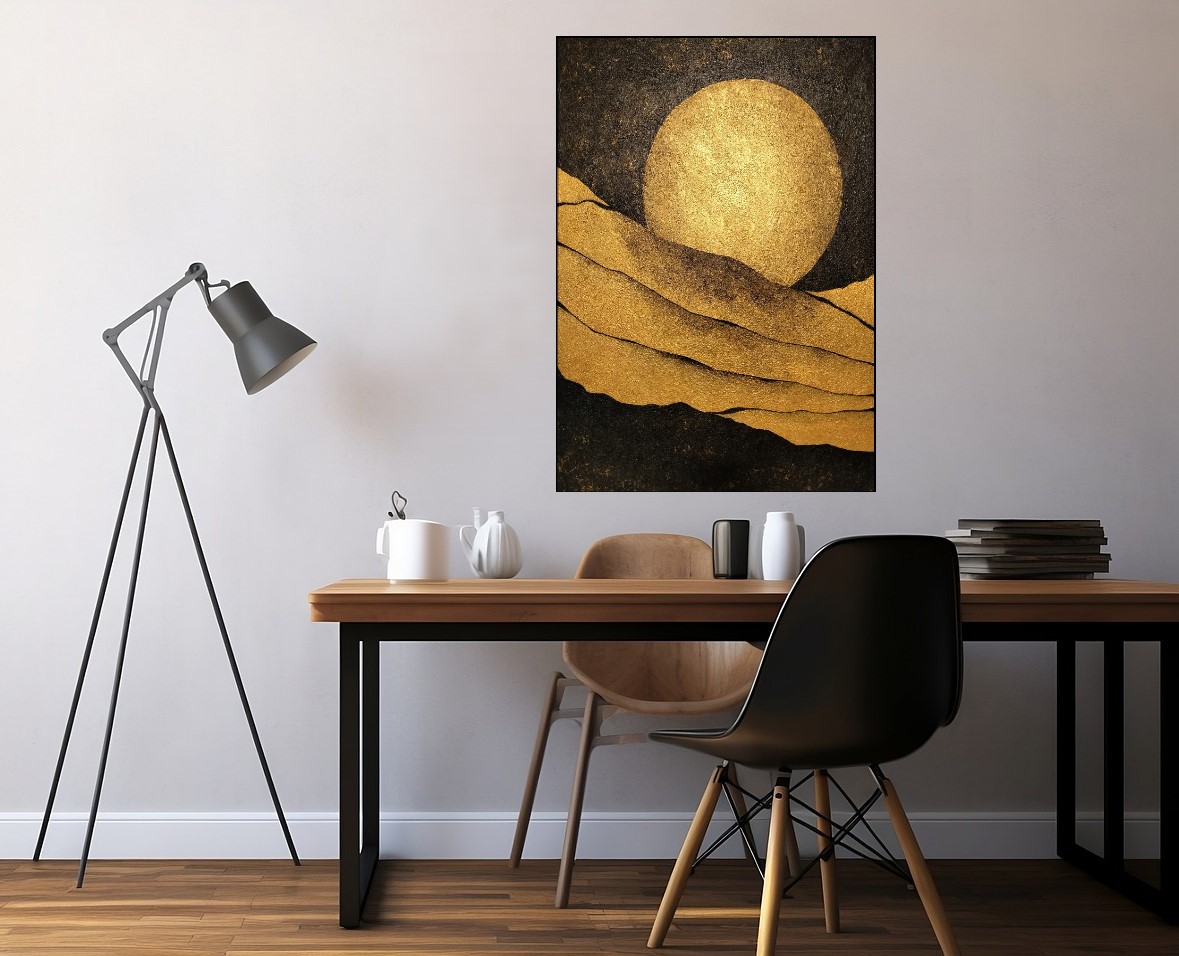 Złota Abstrakcja, akryl na płótnie o wymiarach 60 x 80. Kontrast między złotymi elementami, a czarnym tłem tego obrazu ukazuje minimalistyczną estetykę, prostotę, a jednocześnie głębię abstrakcyjnego przekazu… Te kolory i abstrakcyjna forma obrazu nadadzą każdemu pomieszczeniu eleganckiego charakteru.