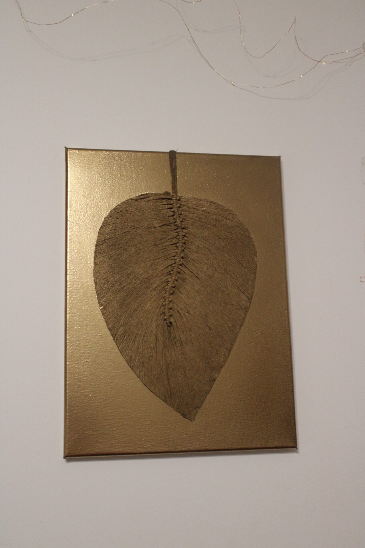 Oryginalna makrama przedstawiona w formie obrazu z elegancja Glamour. Wyrazisty zloty kolor przykuwa uwage. Pasuje niemal do kazdego wnętrza. Obraz ma pomalowane boki więc nie wymaga oprawy w ramę. Może być doskonałym pomysłem na prezent.