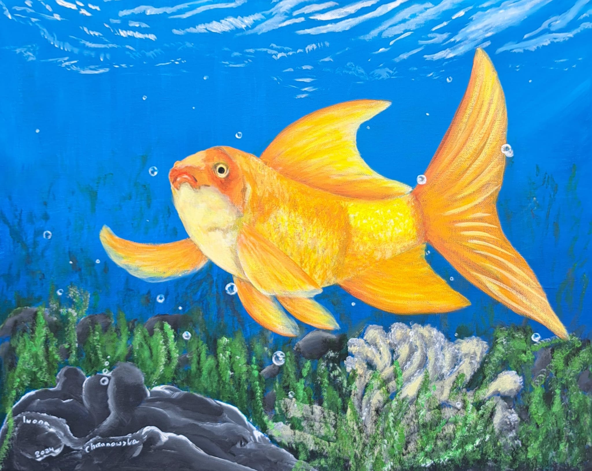 Obraz „Złota rybka” malowany farbami akrylowymi na płótnie 50 x 40 cm. Złota rybka spełnia życzenia.