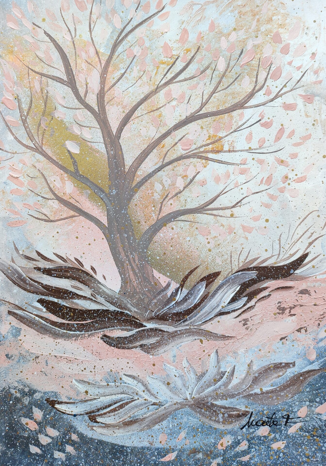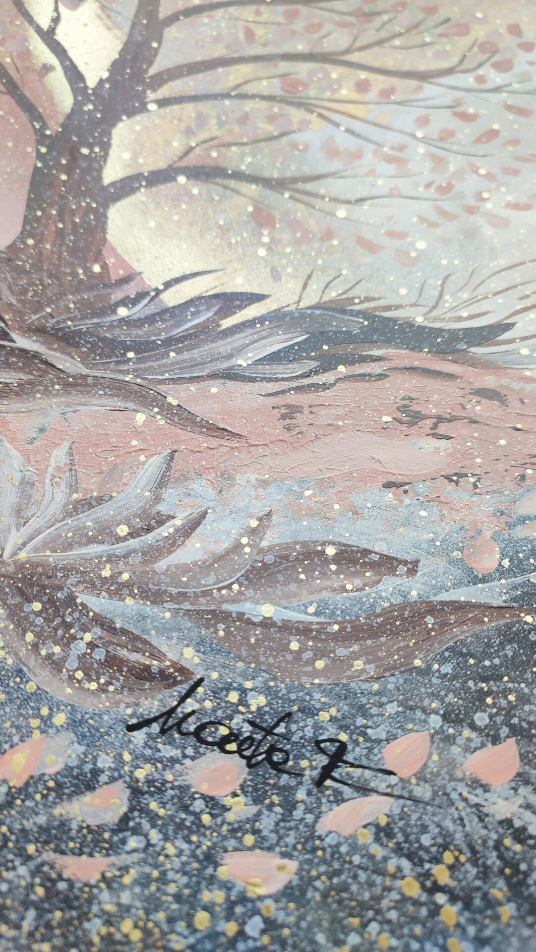 ” Złote blaski” to obraz akrylowy wykonany w technice mieszanej na wysokiej jakości papierze o gramaturze 250g/m 2 w rozmiarze 29×42 cm. Najlepiej wygląda umieszczony w białej ramie. Inspirowany jesiennymi widokami. Delikatnie mieni się złotem pod różnymi kontami.