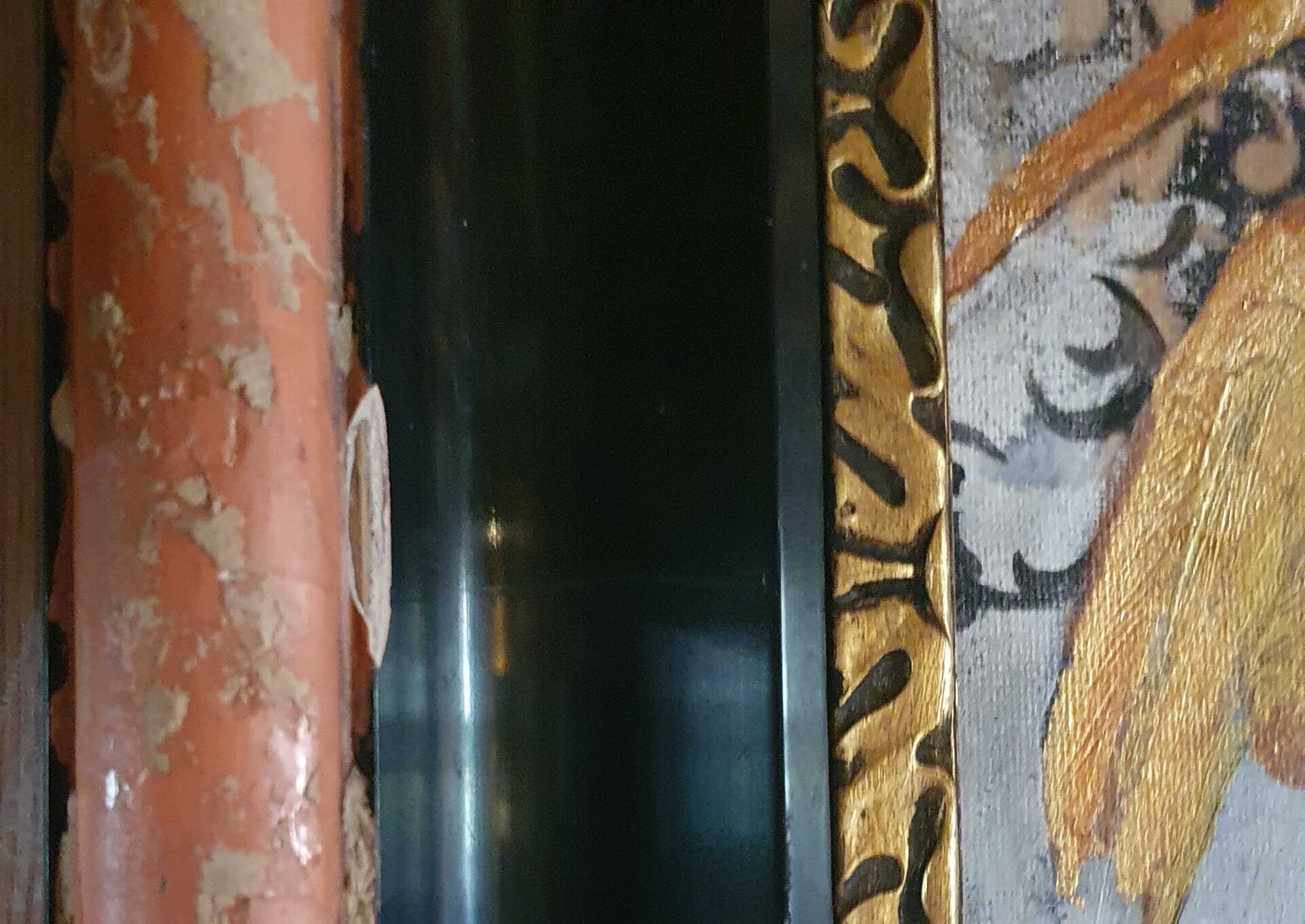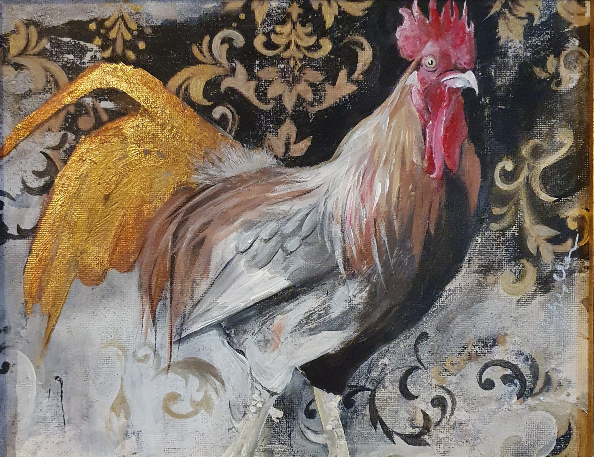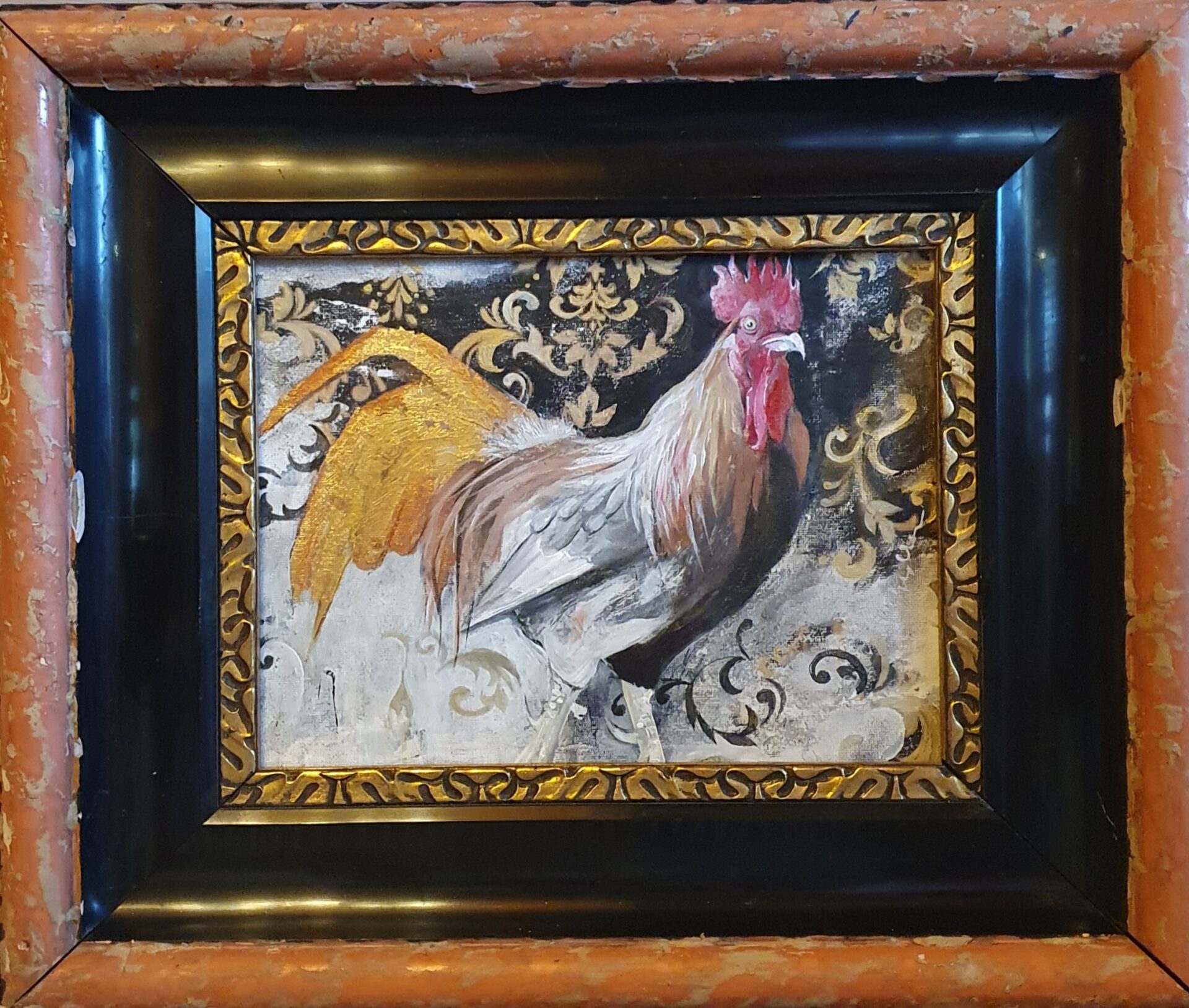 Mały obrazek w dużej ramie:) akryl/transfer/złotko na płótnie, obrazek 24×30 oprawiony w dużą, starą z niemieckiego targu staroci ramę: rama z widocznymi śladami zużycia, przeze mnie tylko umyta i zabezpieczona metalowymi narożnikami: dla miłośników kogutów i starych ram 😉