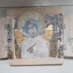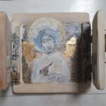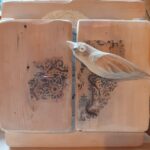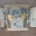 Anioł Stróż z wróbelkiem- akryl, złotko, transfer na połączonych deseczkach: rozeschnięta szpara przez twarz anioła, forma okienka zamykanego na stary haczyk, wewnątrz drzwiczek napis z naklejonych literek, po zamknięciu drewniana figurka ptaszka autorstwa joa_s, całość zabezpieczona werniksem i woskiem.