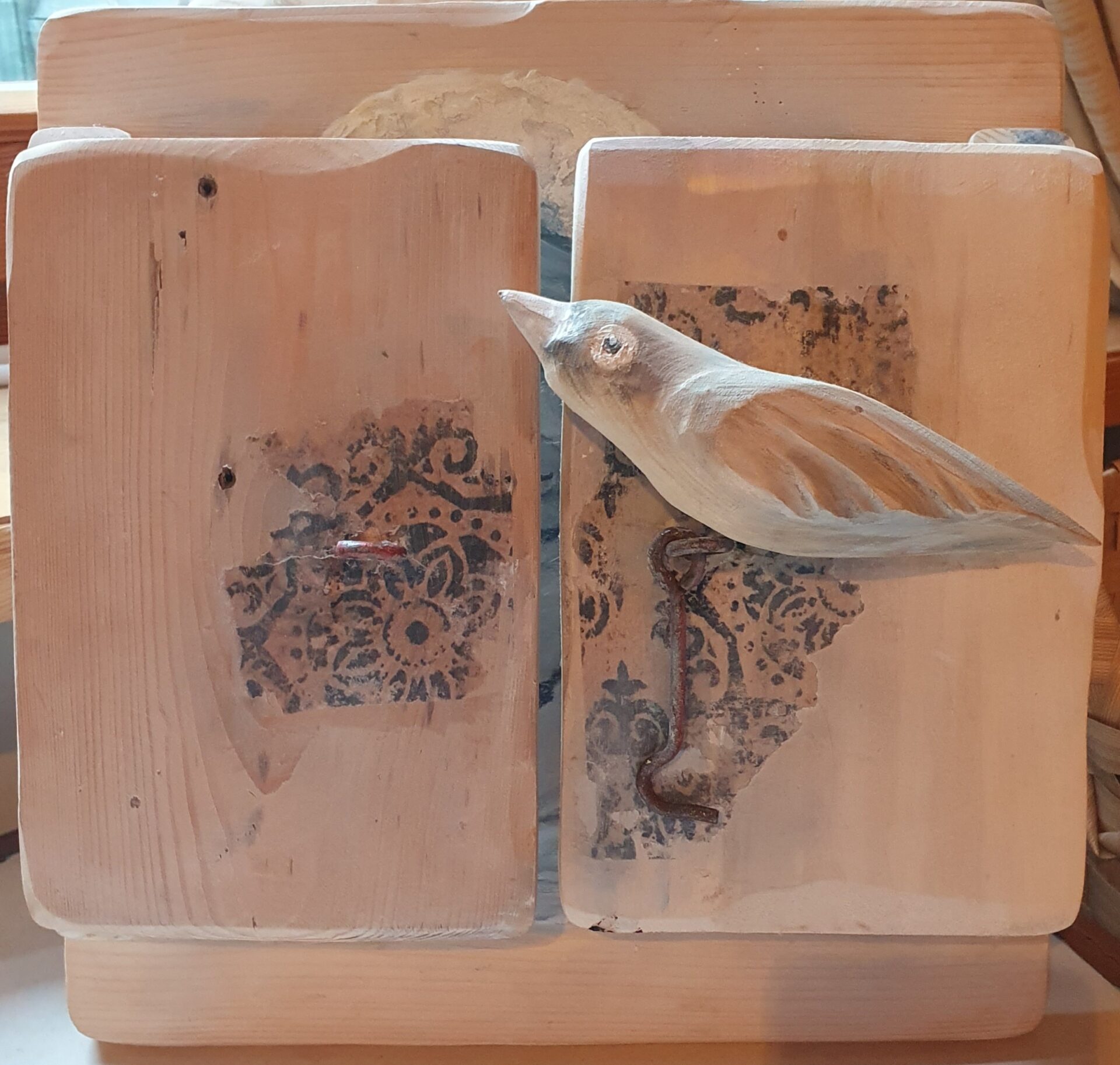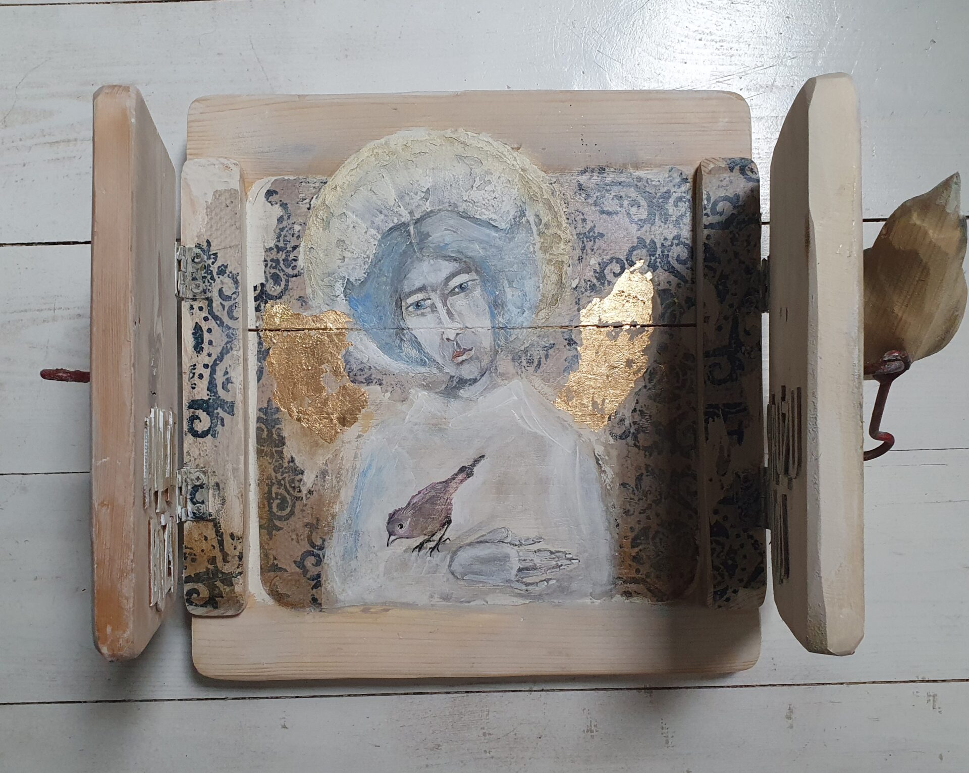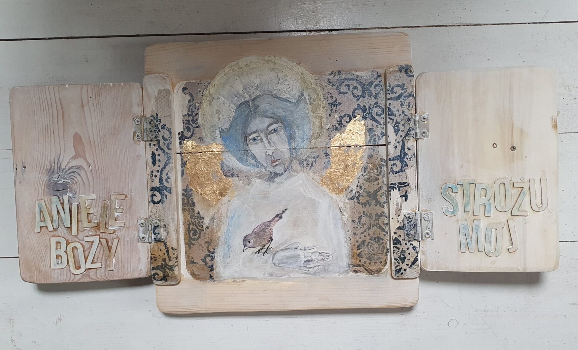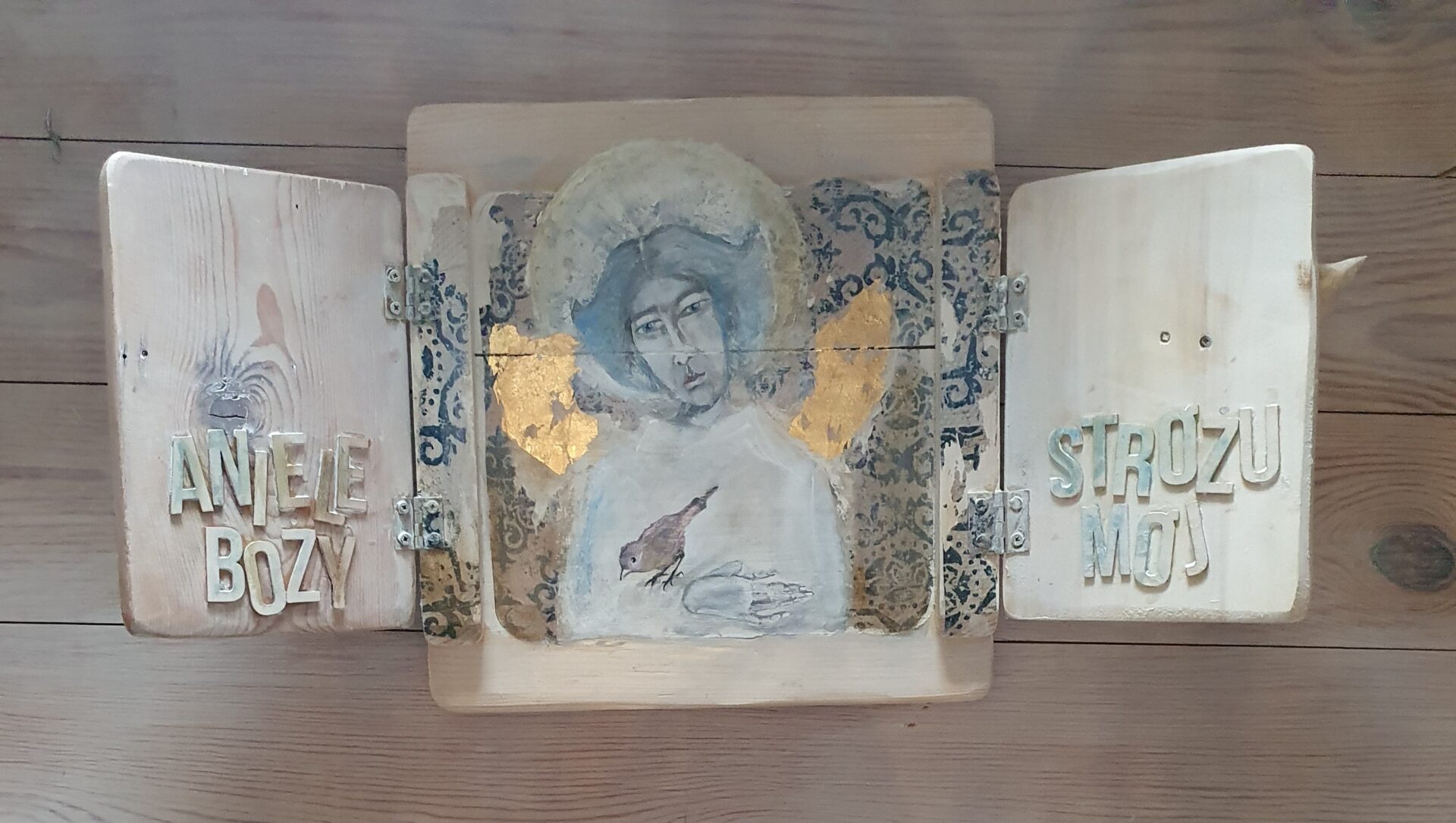 Anioł Stróż z wróbelkiem- akryl, złotko, transfer na połączonych deseczkach: rozeschnięta szpara przez twarz anioła, forma okienka zamykanego na stary haczyk, wewnątrz drzwiczek napis z naklejonych literek, po zamknięciu drewniana figurka ptaszka autorstwa joa_s, całość zabezpieczona werniksem i woskiem.