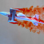 Gdy patrzymy na lecącego ptaka widzimy, że porusza skrzydłami, ale co z tego poruszania w powietrzu dzieje wynika nie widzimy. To samo dotyczy lotu samolotu, tylko w wyjątkowych sytuacjach widać białe smugi pary wodnej z końców skrzydeł lub z grzbietu całego samolotu podczas gwałtownych zmian kierunku lotu bardzo szybkich samolotów. Podczas lądowania dużych samolotów zwirowania powietrza są tak duże, że niebezpieczne czasem dochodzi do wypadków i rozbicia kolejnego lądującego. Badania tych zawirowań są konieczne, ale w tunelach aerodynamicznych nożna zmierzyć siły oporu i siły unoszące ,ale co się dzieje wokół samolotu i za nim, tego nie widać. Można to zobaczyć podczas badań opływów w tunelu hydrodynamicznym. Przed badanym modelem, lub z jego powierzchni, wypuszcza się do tego celu zabarwioną strużkę farby, lub, przy badaniach w oświetleniu UV, płyn fluoryzujący. Fotografia przedstawia model samolotu akrobacyjnego i zaburzenia jakie wywołuje w przepływającej wodzie. Woda jest płynem jak powietrze i to co dzieje się w wodzie odpowiada temu co dzieje się w powietrzu, trzeba tylko dokonać odpowiednich przeliczeń jakościowych, bo wizualnie wszystko się zgadza. Podczas badań w tunelu wodnym można więc zobaczyć to czego w powietrzu nie widać. Zdjęcie zrobiłem podczas badań samolotu akrobacyjnego Harnaś 3 w tunelu hydrodynamicznym Wojskowej Akademii Technicznej. Limit wydruków: bez limitu.