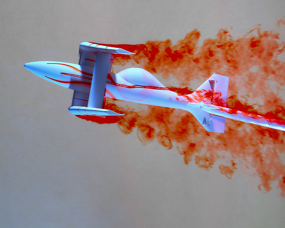 Gdy patrzymy na lecącego ptaka widzimy, że porusza skrzydłami, ale co z tego poruszania w powietrzu dzieje wynika nie widzimy. To samo dotyczy lotu samolotu, tylko w wyjątkowych sytuacjach widać białe smugi pary wodnej z końców skrzydeł lub z grzbietu całego samolotu podczas gwałtownych zmian kierunku lotu bardzo szybkich samolotów. Podczas lądowania dużych samolotów zwirowania powietrza są tak duże, że niebezpieczne czasem dochodzi do wypadków i rozbicia kolejnego lądującego. Badania tych zawirowań są konieczne, ale w tunelach aerodynamicznych nożna zmierzyć siły oporu i siły unoszące ,ale co się dzieje wokół samolotu i za nim, tego nie widać. Można to zobaczyć podczas badań opływów w tunelu hydrodynamicznym. Przed badanym modelem, lub z jego powierzchni, wypuszcza się do tego celu zabarwioną strużkę farby, lub, przy badaniach w oświetleniu UV, płyn fluoryzujący. Fotografia przedstawia model samolotu akrobacyjnego i zaburzenia jakie wywołuje w przepływającej wodzie. Woda jest płynem jak powietrze i to co dzieje się w wodzie odpowiada temu co dzieje się w powietrzu, trzeba tylko dokonać odpowiednich przeliczeń jakościowych, bo wizualnie wszystko się zgadza. Podczas badań w tunelu wodnym można więc zobaczyć to czego w powietrzu nie widać. Zdjęcie zrobiłem podczas badań samolotu akrobacyjnego Harnaś 3 w tunelu hydrodynamicznym Wojskowej Akademii Technicznej. Limit wydruków: bez limitu.