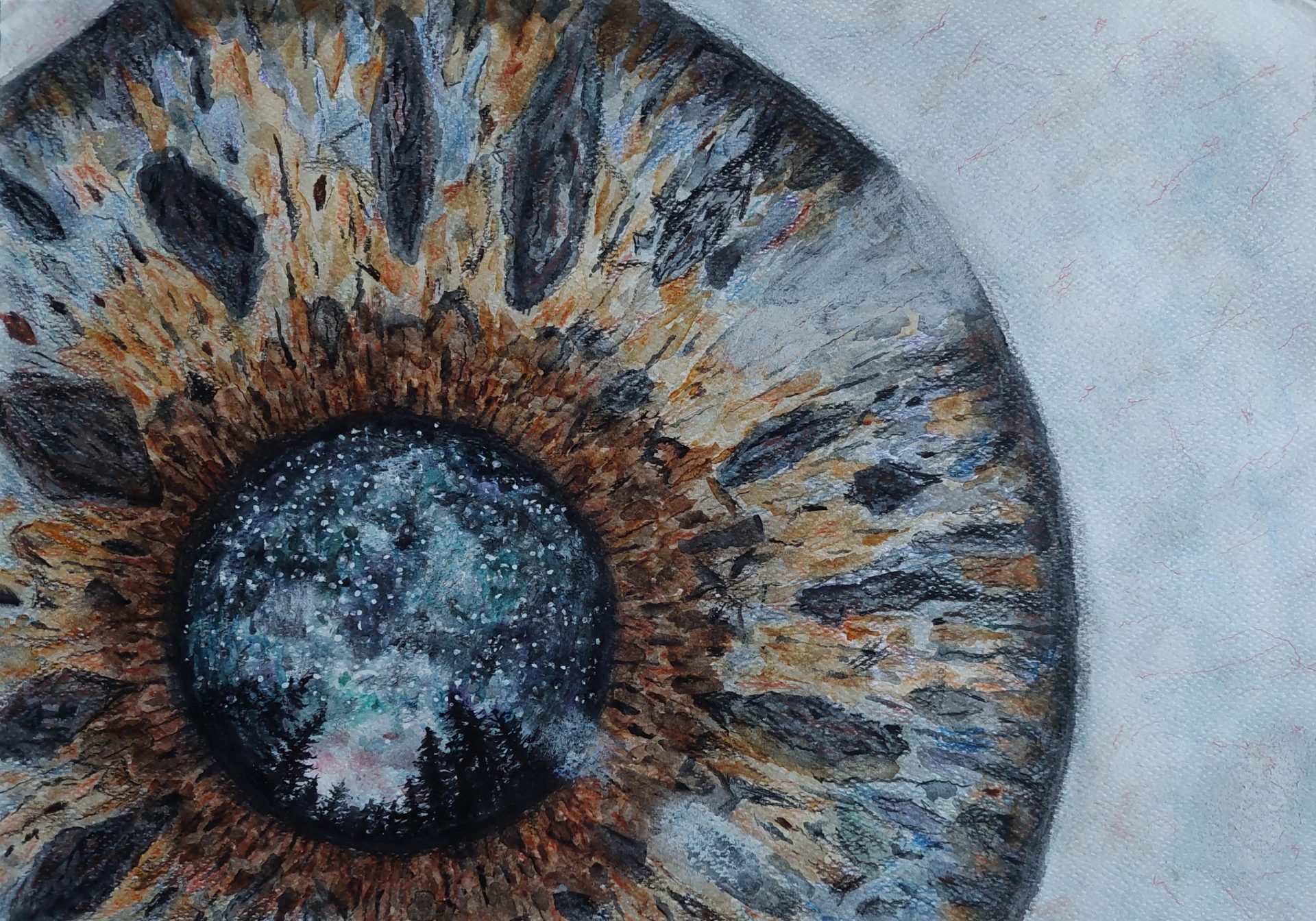 Abstrakcyjne wielobarwne dzieło. Obraz źrenicy oka, odbicie lasu nocą, przy gwieździstym niebie.