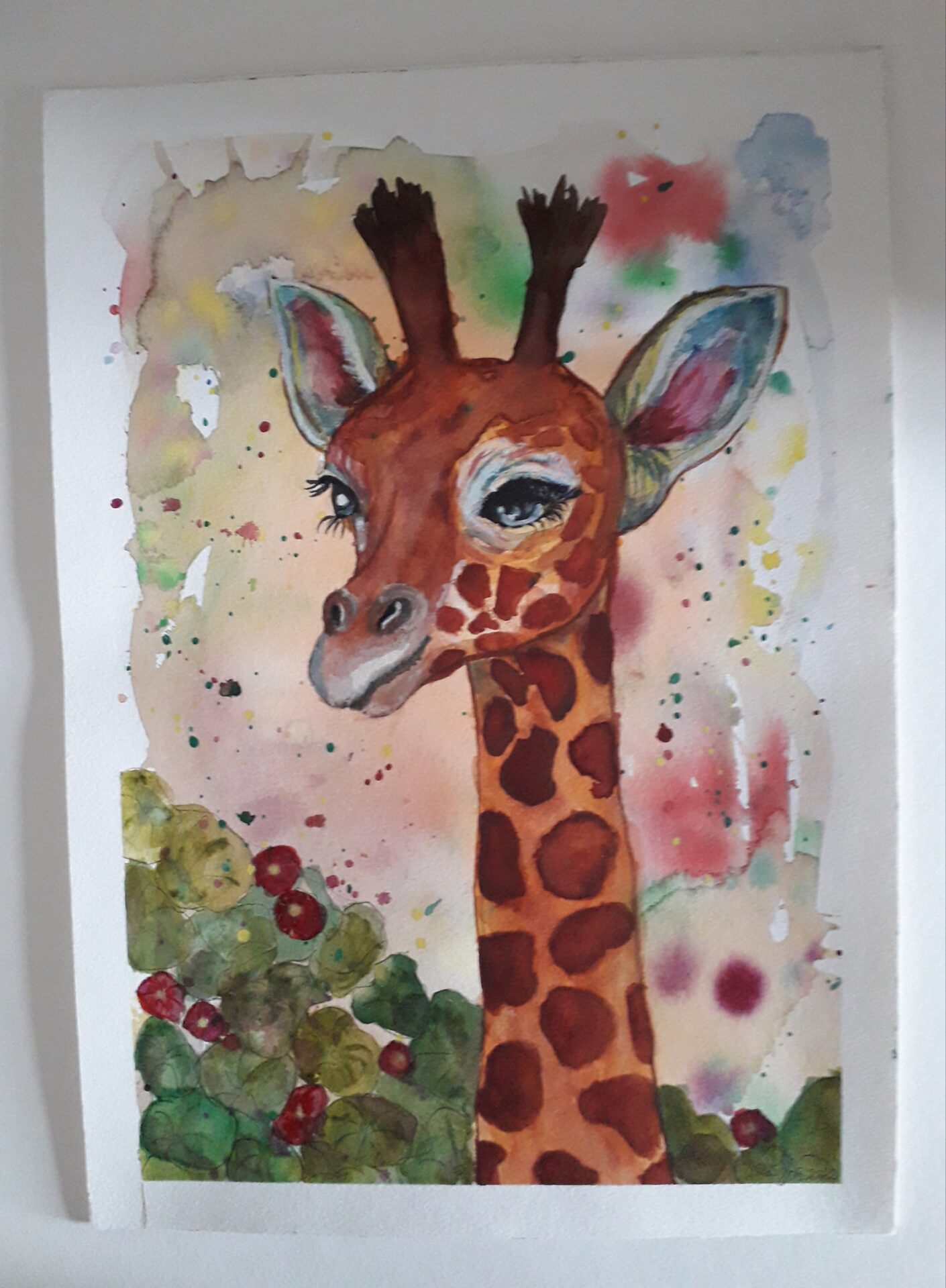 Żyrafa. Akwarela na bawełnianym papierze o gramaturze 300 g. Format A3 . Obszar pracy 38 x 26 cm. Idealna do pokoju dziecka. Koszt wysyłki ok. 20 zł ( kurier lub paczkomat)