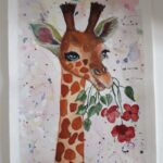 Żyrafa z kwiatami. Akwarela na bawełnianym papierze o gramaturze 300 g. Format A3 . Obszar pracy 38 x 26 cm. Idealna do pokoju dziecka. Koszt wysyłki ok. 20 zł (kurier lub paczkomat)