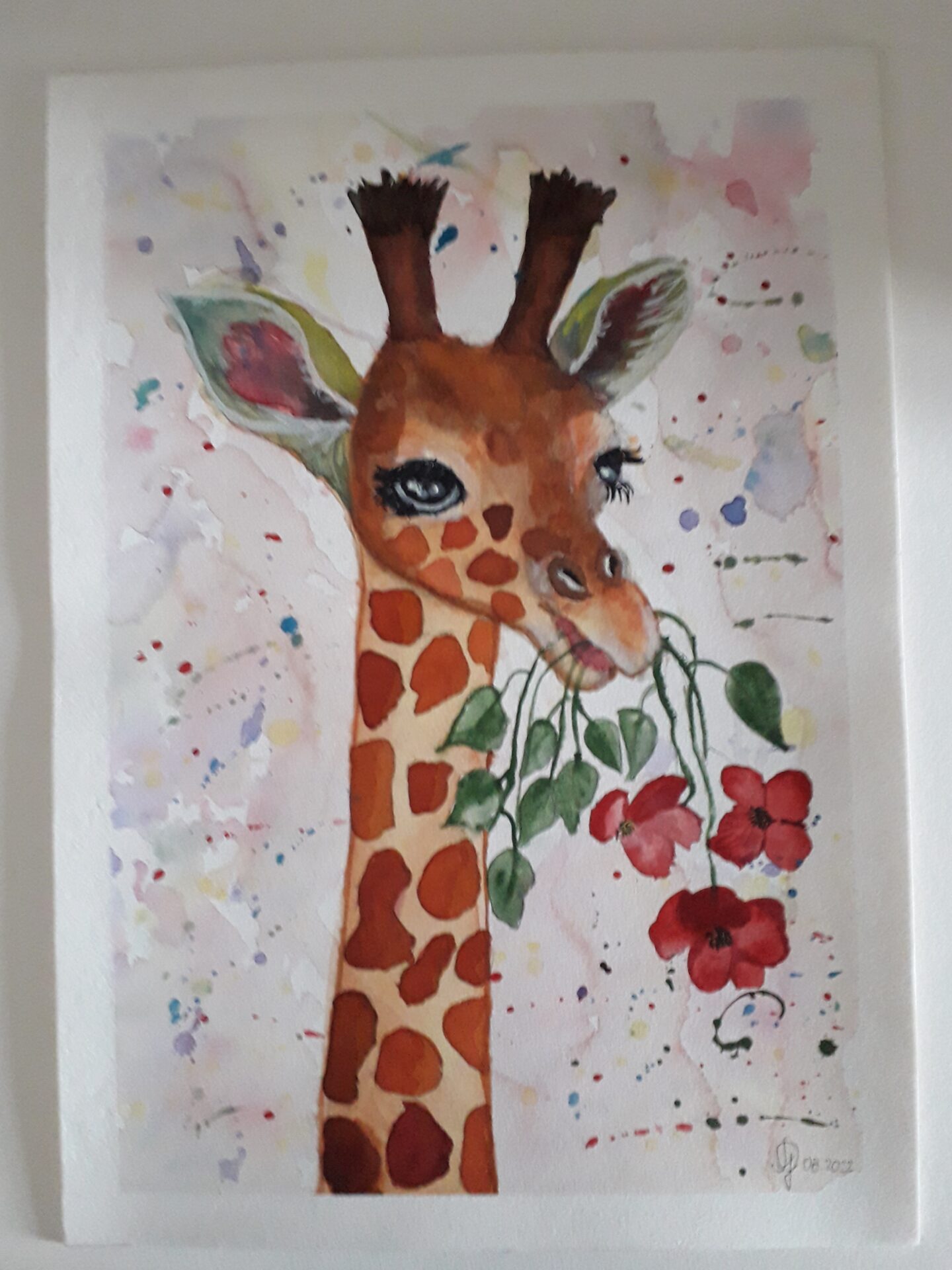 Żyrafa z kwiatami. Akwarela na bawełnianym papierze o gramaturze 300 g. Format A3 . Obszar pracy 38 x 26 cm. Idealna do pokoju dziecka. Koszt wysyłki ok. 20 zł (kurier lub paczkomat)